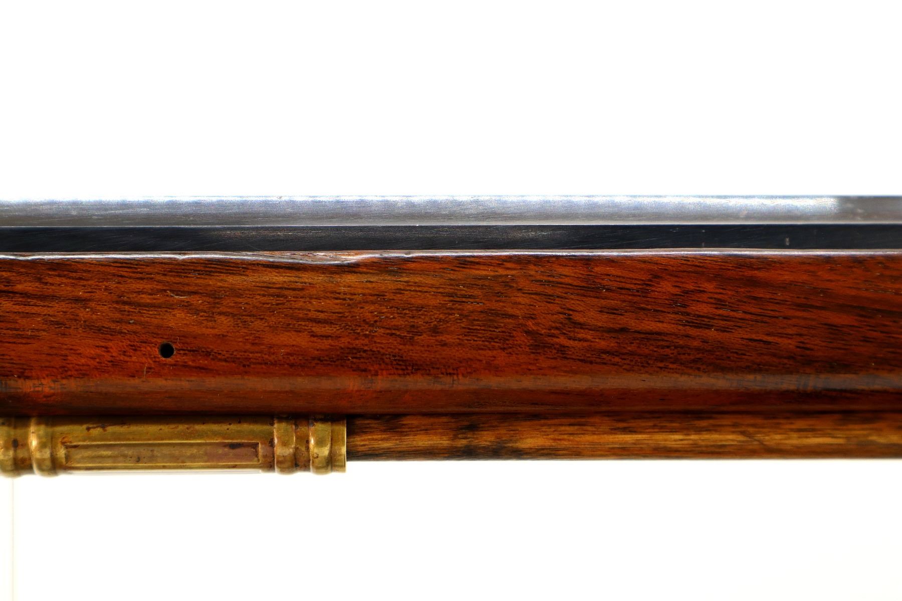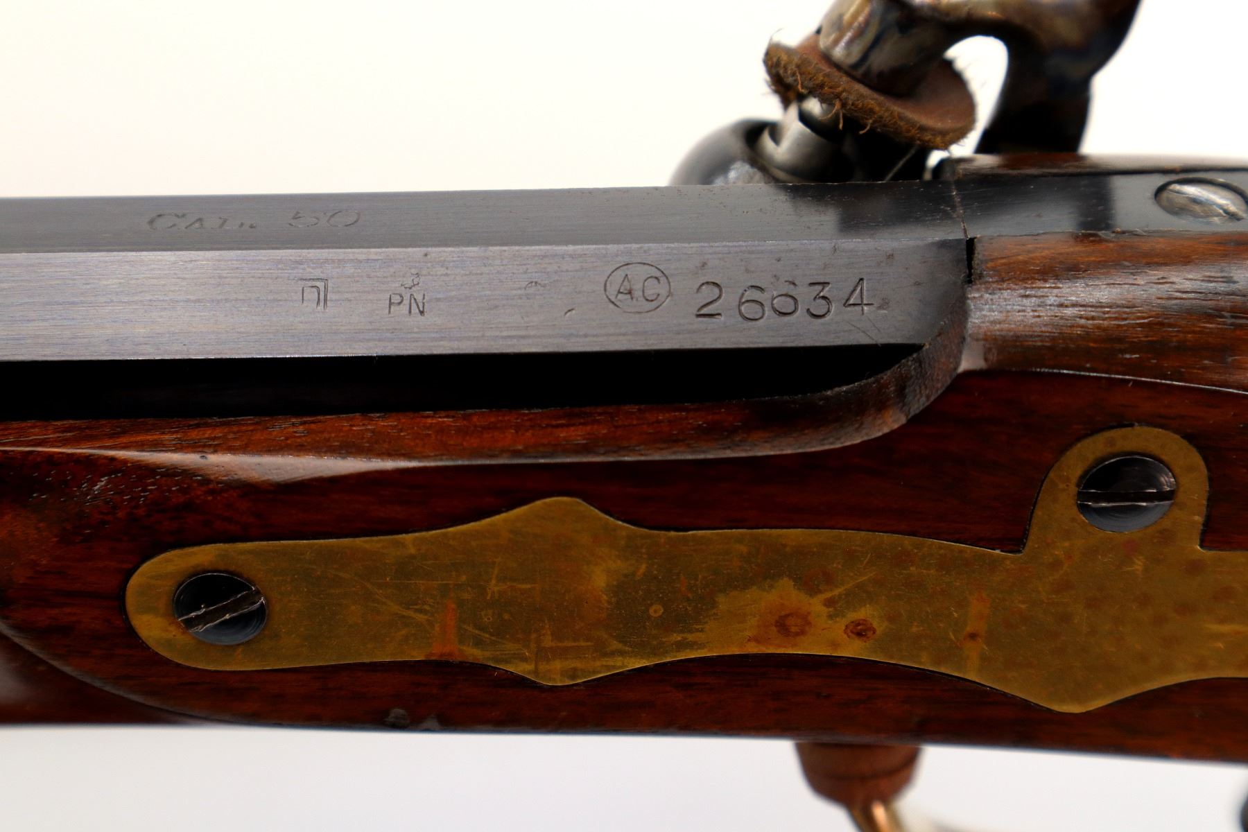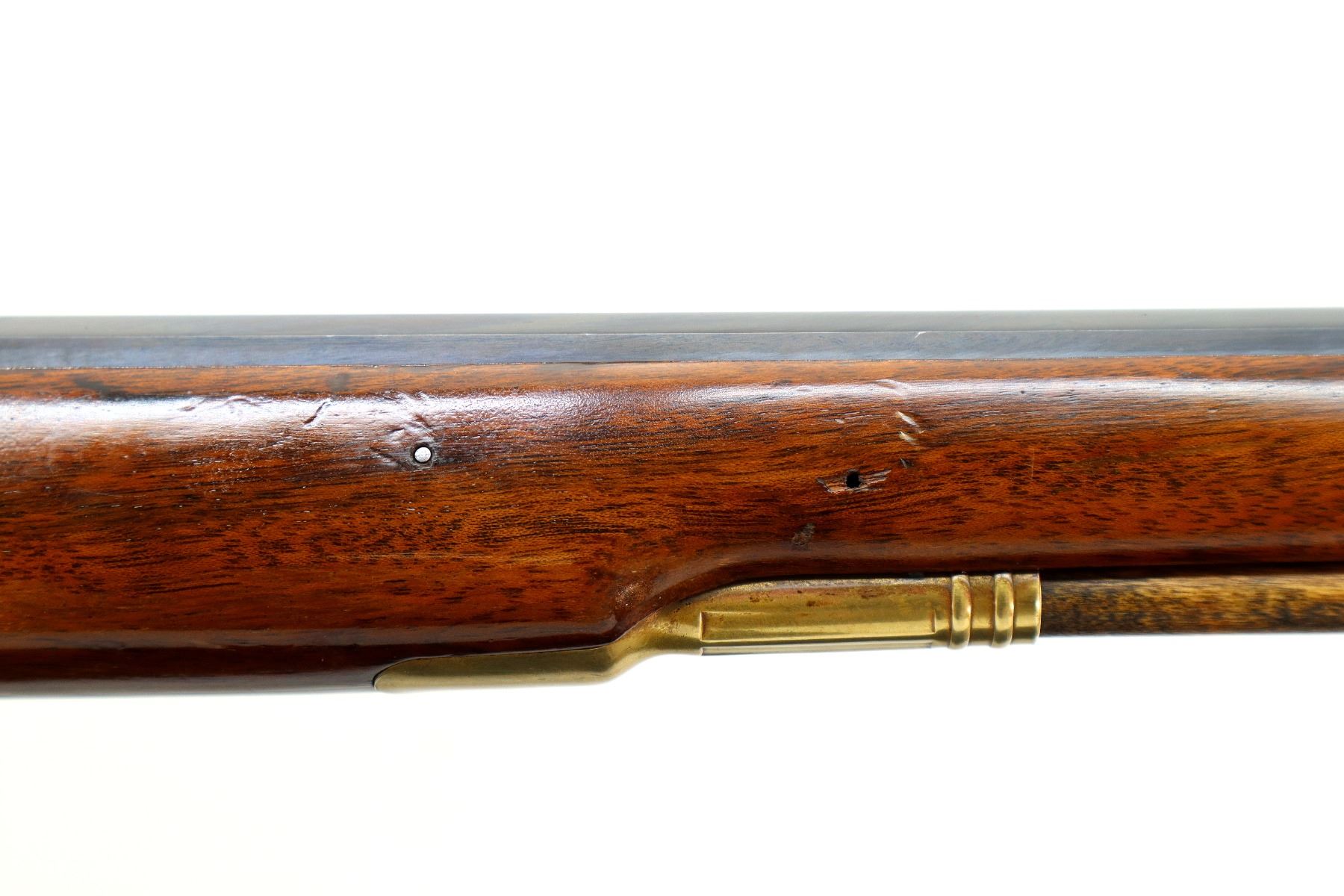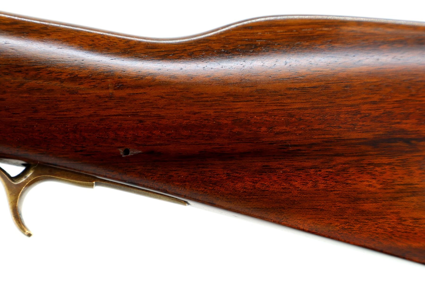Main Description: Red fiber optic blade front sight, adjustable u notched full buckhorn rear sight, blued octagon barrel, engraved lock with checkered spur hammer that functions, nipple is intact. One piece full length wood stock, straight grip, smooth curved brass butt plate, patch box, finger rest trigger guard and nose cap, wood ramrod with brass tip.