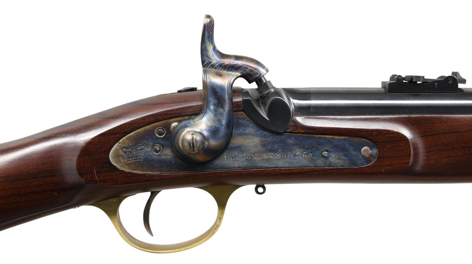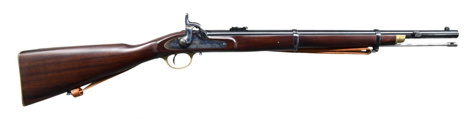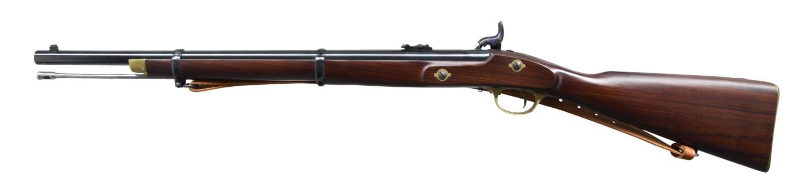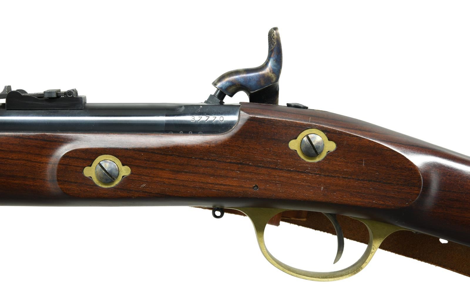 CARBINE MUSKETOON. Cal. 58. S# 37770. Bbl. 24" rnd. Barleycorn front sight & carbine rear sight. Blued bbl. & case colored lock. Walnut stock set w/ brass furniture & slotted tipped ramrod. Marked on triggerguard tang "MADE IN ITALY". Brown leather sling on swivels. CONDITION: near excellent metal & wood finish w/ light handling marks. Near excellent bore; appears unfired. (01-23766/MD). ANTIQUE. $500-650