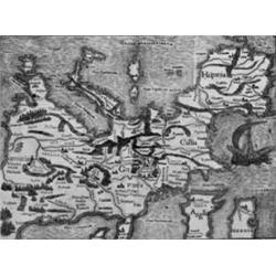 “Europa das ein drittheil der Erden...”. Kolorierte Holzschnittkarte aus Seb. Münster (dt. Ausgabe), um 1550. - Qu.-4<SUP>o</SUP>. Zeigt in Abänderung der Himmelsrichtung das gesamte Europa bis nach Rußland sowie Teile Englands und Dänemarks. Mit geglätteter Bugfalte und kleinen Randbeschädigungen aufgezogen. Leicht stockfleckig und wasserrandig.