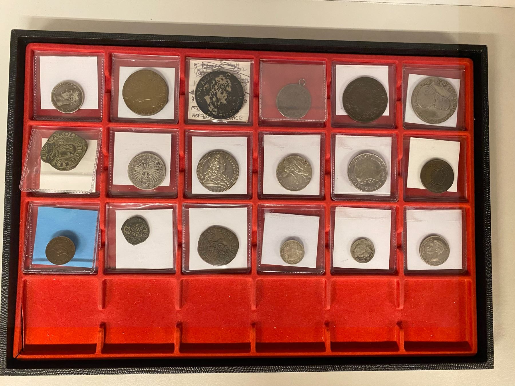 EUROPE: LOT of 18 coins, including France (4: Napoleon AR 5 francs year 12, Fine, holed and discolored; AR franc 1829, VF cleaned; AE 2 sols 1791; and a Louis XV silver jeton), Italy (2: AR 2 lire 1905, and a Naples AE grano 1680), Malta (1: AR 2 scudi 1774, Fine, scratches), Portugal (1: 10 reis 1777, nice EF), Spain (10, with five struck silvers between 1867 and 1904 (escudo 1867, 2 pesetas 1870, peseta 1876, 50 centimos 1894 & 1904(10)), plus two struck coppers, and three hammered coins;); various conditions, many EF, some with light cleaning, nearly all attributed on accompanying holders; retail value $750, lot of 18 pieces.