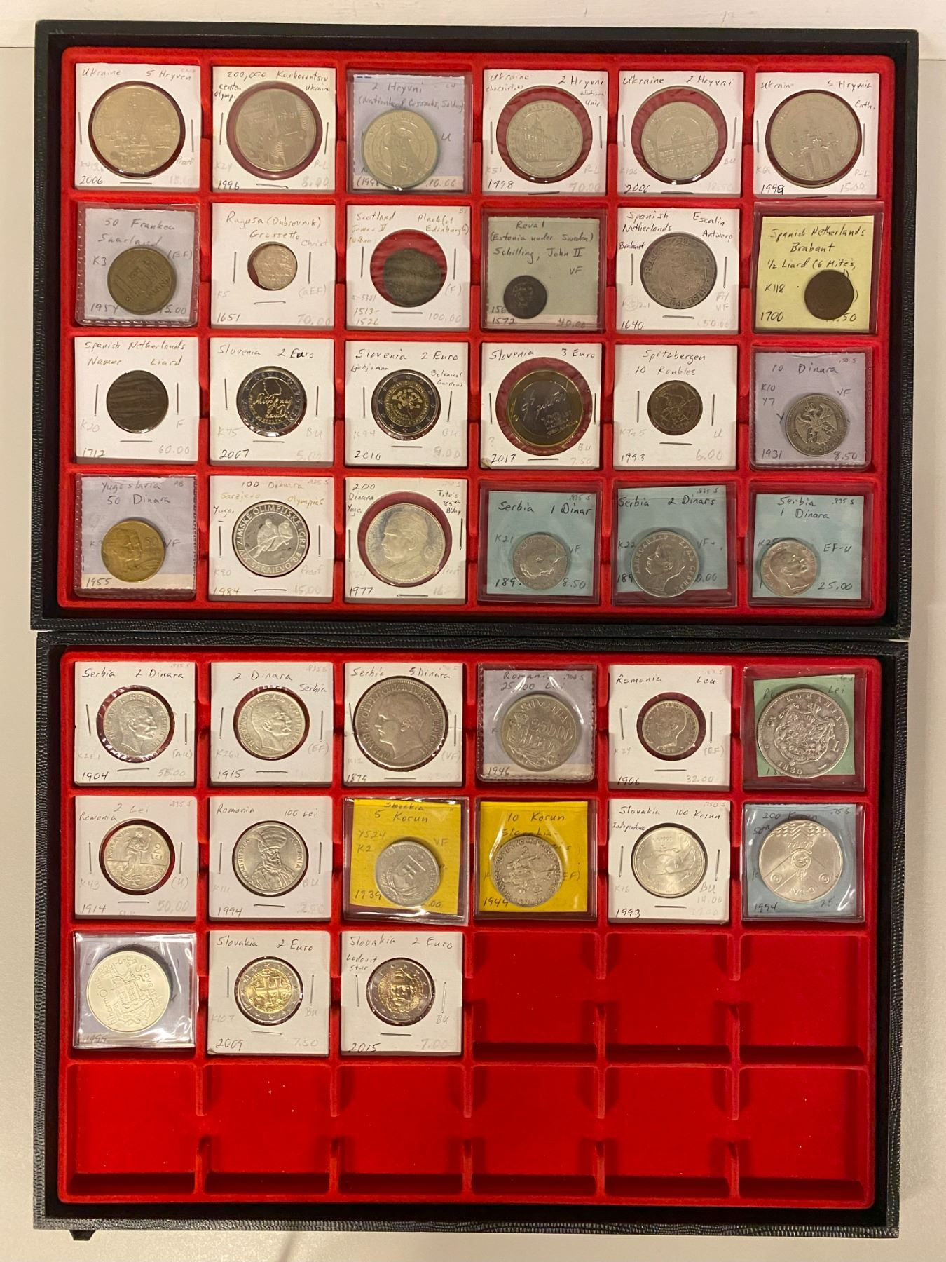 EUROPE: LOT of 39 coins, including a grossetto of Ragusa, 50 franken of Saarland, a well worn plack of James V of Scotland, a schilling of Reval, 7 coins of Slovakia (4 silver), 6 copper nickel crowns of Ukraine, 6 silver coins of Serbia including a F+ 1879 5-dinara, 5 coins of Romania (4 silver including an AU 1906 leu) and 11 others; retail value $700, lot of 39 pieces.