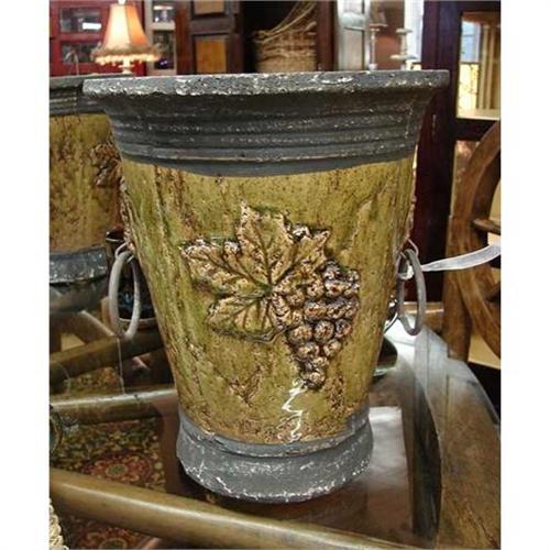GREAT PIECE WITH VINEYARD GRAPE EMBOSSED DESIGN, LION HEAD MOTIF ON EITHER SIDE WITH IRON RING, OLIVE GREEN IN COLOR, PLEASE EMAIL US FOR A SHIP QUOTE.