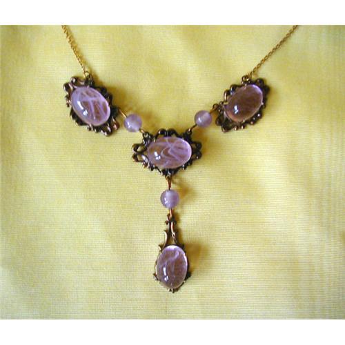 EUROPEAN ART NOUVEAU PERIOD / CIRCA 1890~1900 / ART GLASS NECKLACE SET IN GILT METAL. The beautiful stones are large art glass hand-blown cabochons of pale rose' color with free-form white ribbons swirling inside each stone. 16 1/2" necklace on chain ...3 center stones are 3 1/2+" wide ...the drop hangs 2+" from the center 3 stones. This beautiful necklace is very collectable.