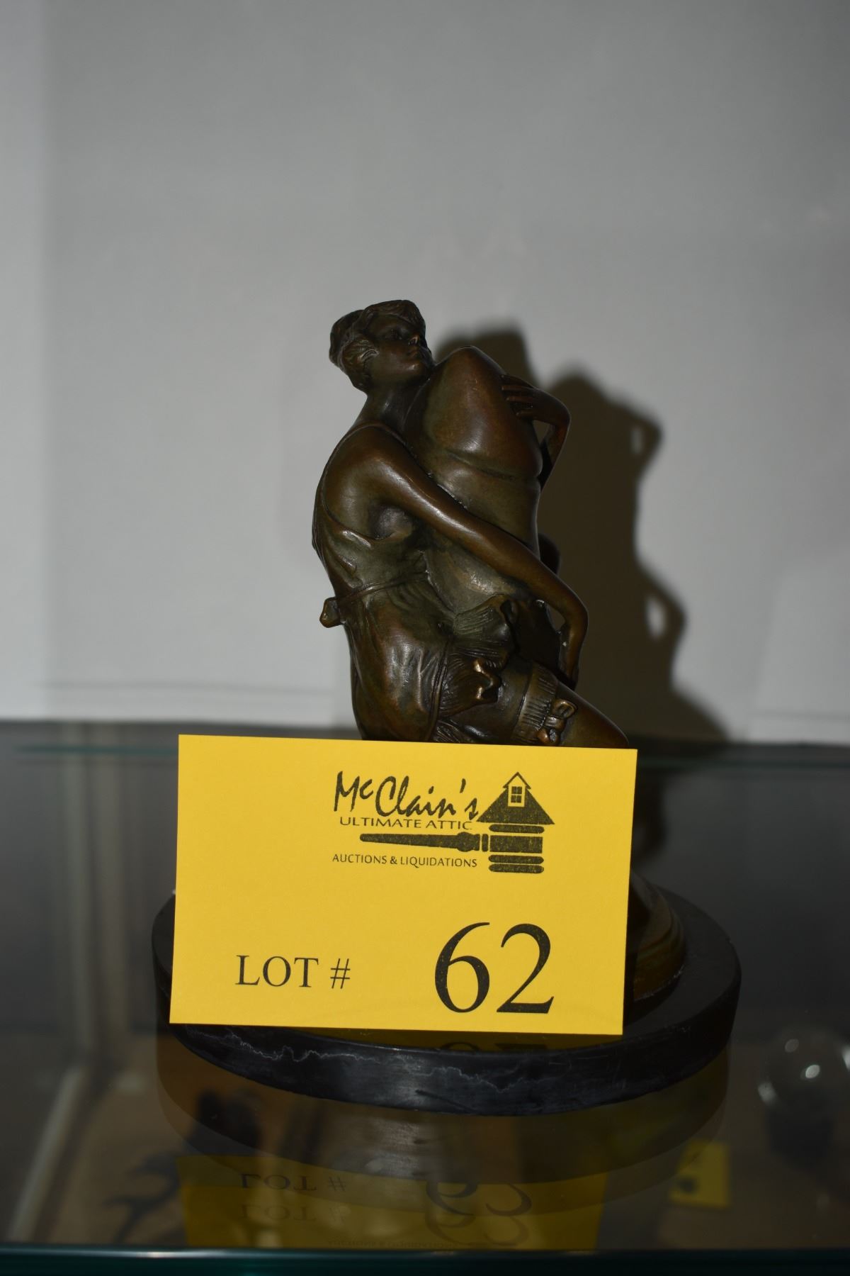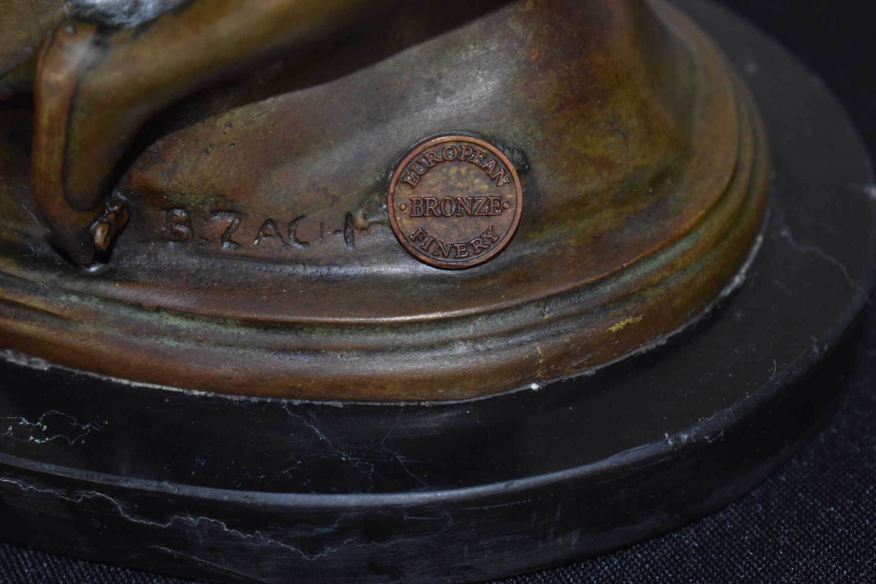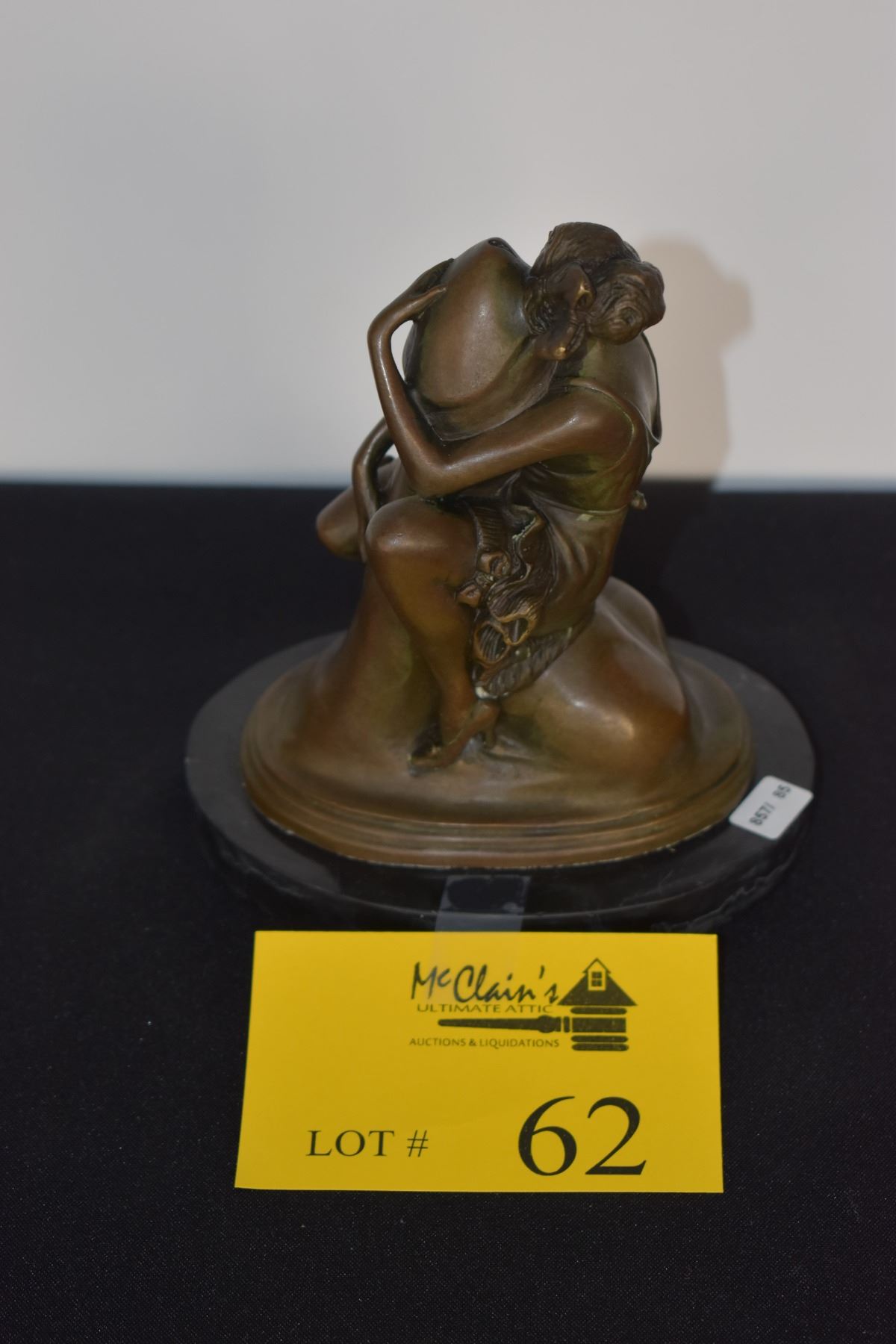 EUROPEAN BRONZE STATUE, FEMALE W/PHALLIC SYMBOL ON MARBLE BASE; SIGNED
