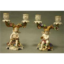 1 PAR TVÅRARMADE KANDELABRAR, VON SCHIERHOLZ, DEKOR AV SPELANDE AMORINER, POLYKROMA LÖSA STRÖBLOMMOR, H21