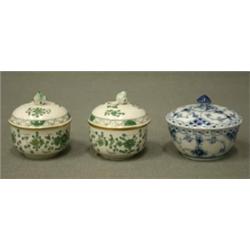 2 BONBONJÄRER, GRÖN BLOMSTERDEKOR, LOCKKNOPP I FORM AV ROS, MEISSEN, 1 BONBONJÄR, ROYAL COPENHAGEN "MUSSELMALET" (3)