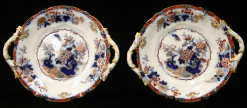 1 PAR FAT, BLADFORMADE HÄNKLAR, POLYKROM BLOMSTERMÅLNING, ENGLAND 1800-TAL, D25 (ETT MED KANTNAGG) (2)