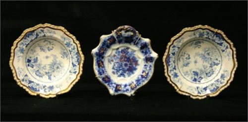 UPPLÄGGNINSFAT, 1 PAR DJUPA TALLRIKAR, BLÅ DEKOR AV BLOMMOR SAMT GULD, ENGLAND C. 1850 D23-26 (3)
