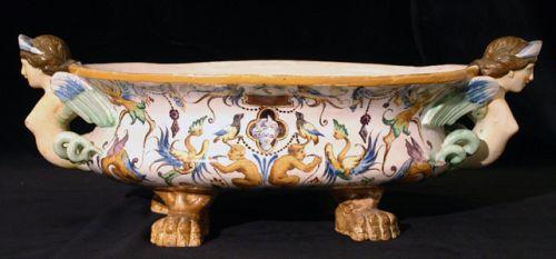 JARDINJÄR, ITALIENSK MAJOLIKA, OVAL PÅ LEJONFÖTTER, HANDTAG I FORM AV BEVINGADE KVINNOFIGURER, POLYKROM DEKOR AV FÅGLAR OCH FIGURER, 1800-TAL DEL, H17, B54 (SMÄRRE SKADOR)