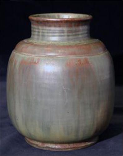VAS, STENGODS, RUND BUKIG FORM, MOSSGRÖN, SIGN. CARL HALIER 1928, EGEN ATELJÉ , BREDGADE, KÖPENHAMN, INNAN HAN BÖRJADE PÅ ROYAL COPENHAGEN, H20