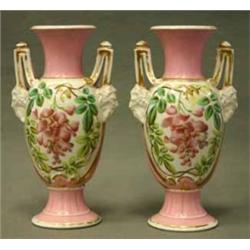 1 PAR VASER, BALUSTERFORMADE, UPPSVÄNGDA HÄNKLAR, ANSIKTEN I RELIEF, MÅLAD BLOMSTERDEKOR PÅ ROSA GRUND, SENEMPIR C. 1850, H24