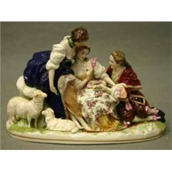 FIGURGRUPP, ROKOKOKLÄDDA FIGURER MED FÅR, TYSKLAND, 1800-TALETS SLUT, H16, L26 (KONSTLAGNING)