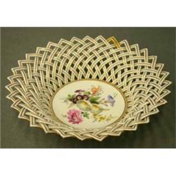 GALLERSKÅL, MEISSEN, POLYKROM BLOMSTERMÅLNING, GENOMBRUTET FLÄTAT GALLER, 1800-TALETS SENARE DEL, H8, D28 (KONSTLAGNING)