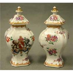 1 PAR LOCKURNOR, BALUSTERFORMADE, POLYKROM VAPEN OCH BLOMSTERDEKOR, SAMSON, 1800-TAL, H15