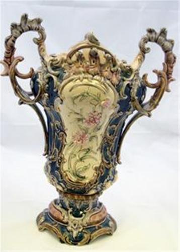 VAS, MAJOLIKA, POLYKROM BLOMDEKOR, UPPSVÄNGDA HÄNKLAR, TYSKLAND C. 1880, H38