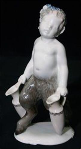 FIGURIN, POJKE MED BOCKFÖTTER HÅLLANDE 2 VINKANNOR, ROSENTHAL, SIGN. K HIMMELSTOSS, H19 (SMÄRRE TILLVERKNINGSSPRICKA)
