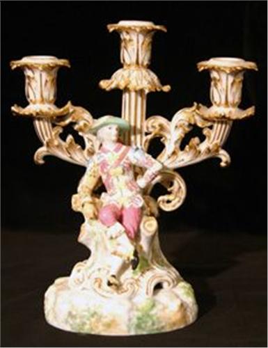 KANDELABER, ROKOKOKLÄDD HERRE MED, 3 LJUSPIPOR, POLYKROM DEKOR, JACOB PETIT, H28 (KONSTLAGNINGAR)