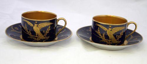 1 PAR KAFFEKOPPAR MED FAT, ÖRNDEKOR OCH NAPOLEONMÄRKE I GULD PÅ BLÅ GRUND, SEVRES, 1800-TAL (2)