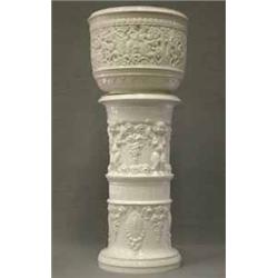 BLOMSTERPIEDESTAL MED KRUKA, VIT GLASYR, RELIEFDEKOR AV FRUKTER, BLOMMOR OCH BARN, OKÄND TYSK MÄRKNING, 1800-TALETS SLUT, H90, D37 (SMÅ BOTTENNAGG)