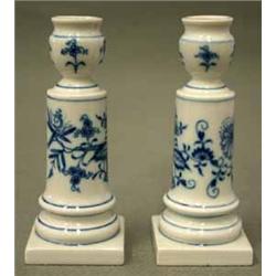 1 PAR LJUSSTAKAR, FYRKANTIG FOT, RUND STAM, DEKOR I BLÅVITT MÖNSTER LÖKMÖNSTER, MEISSEN, H15