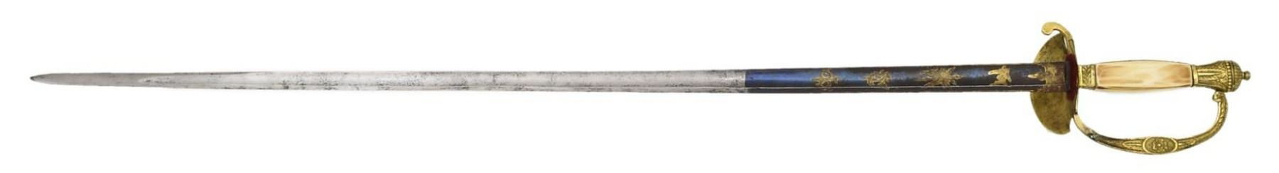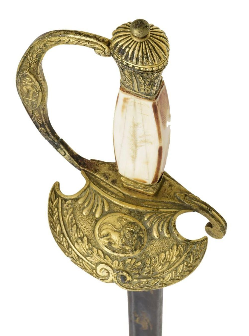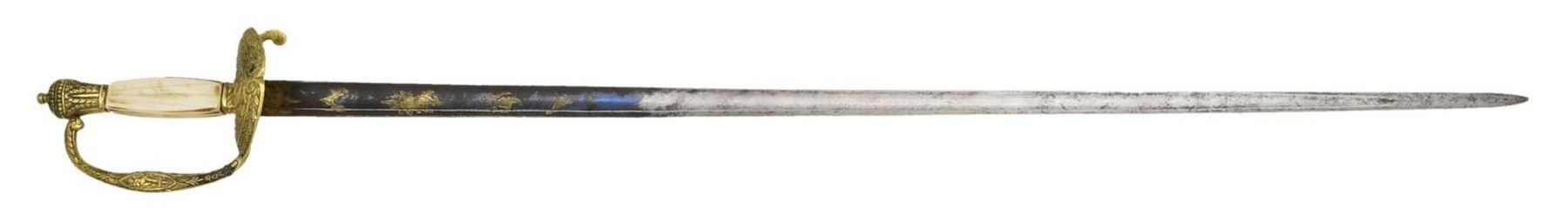 Overall length: 37”. Blade length: 31 1/2". This European court sword likely dates from about 1840 to 1860. The blade has a single wide fuller and is decorated with gold highlighted etching on a blued field over the first 9 3/4". Etching includes foliate & patriotic motifs. A small panel near the hilt is etched “A S & C”. Gilded brass hilt with a single turned down guard that features a lion in oval above a decorative swag. Knuckle bow depicts Cupid on one side and a 4-petal flower on the other. Fancy foliate & geometrically decorated pommel. Certifiably antique ivory grip. No scabbard. CONDITION: blade has a light gray patina with minor staining. Blued field is approx. 80% complete. Gold highlighted etching is nearly 100%. Hilt retains most of its original gilded finish. There is a small repair at the base of the knuckle bow. Grip appears to have been heavily scrubbed. (02-20020/BF). $250-400.