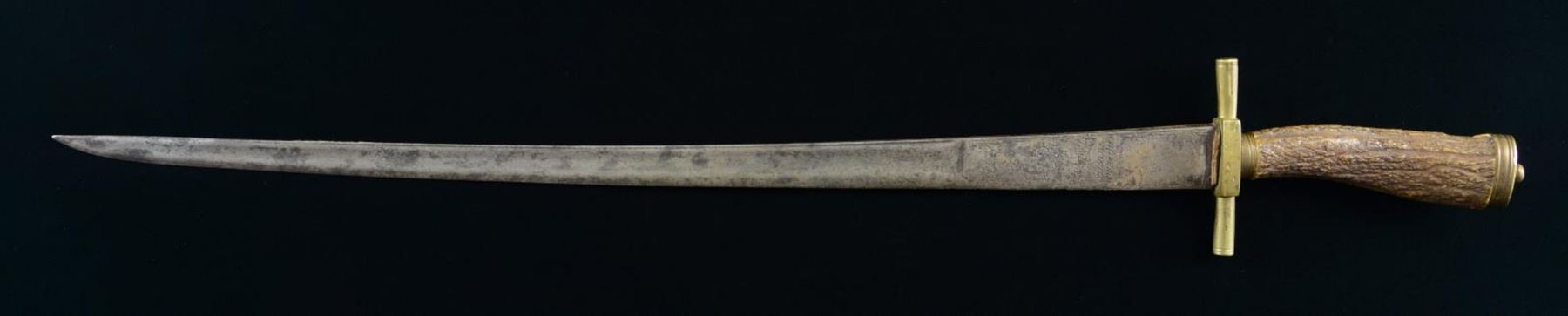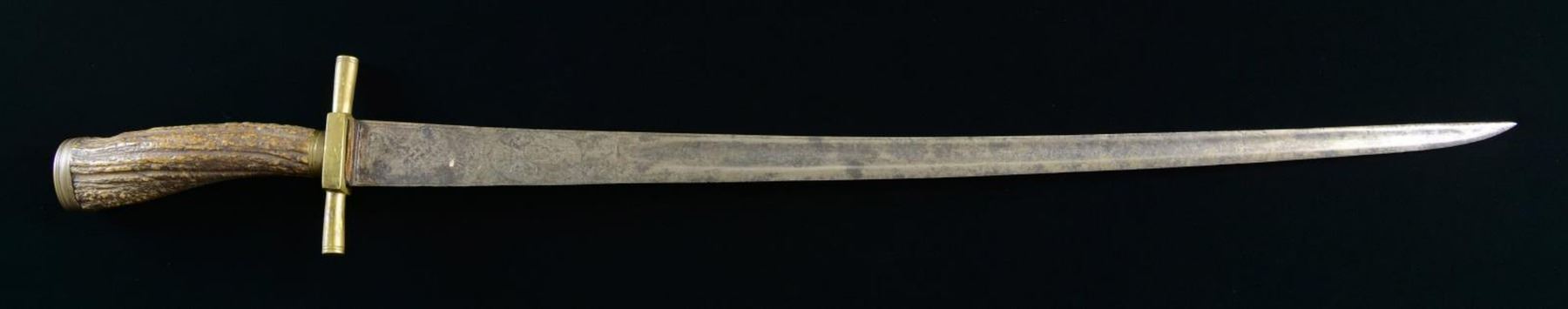 Overall length: 23 1/2". Blade length: 18 1/2". A good example of a 19th century European hunting sword, likely of French origin. The slightly curved blade has a single medium sized fuller and is etched over 6” of its length. Etching includes foliate motifs with a dog or lion on both sides. There is a short inscription on both sides that appears to be French. Simple brass crossguard along with a brass ferrule & pommel. Horn grip. No scabbard. CONDITION: blade has a dark, mottled patina but the etching remains visible & reasonably crisp. Hilt has a deep patina and shows light overall wear. (02-20097/BF). $300-450.