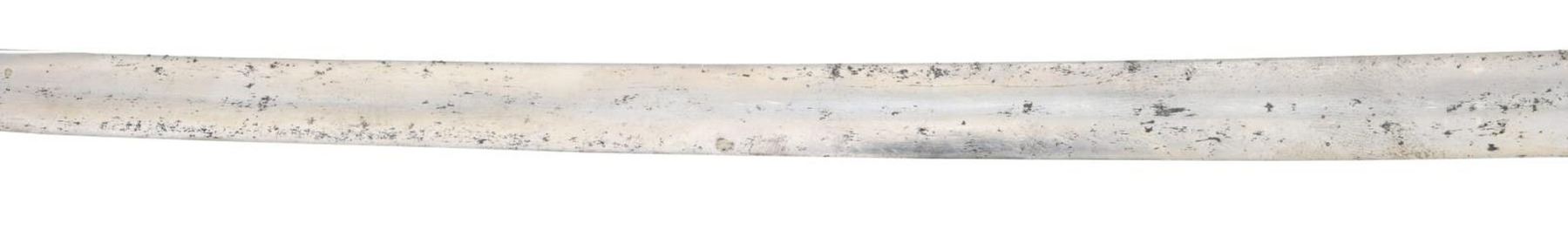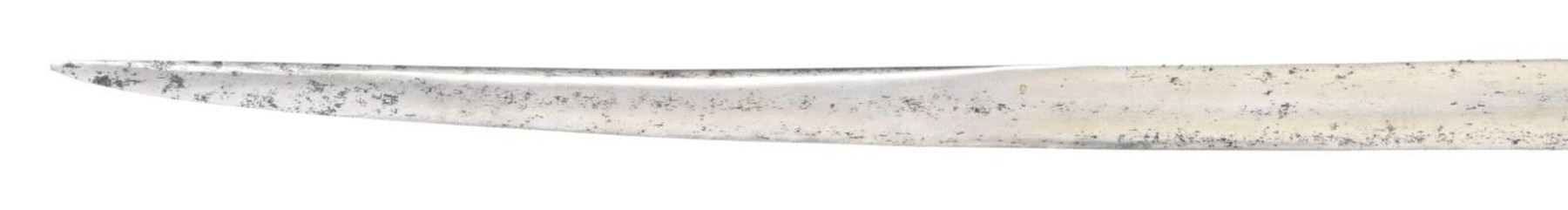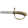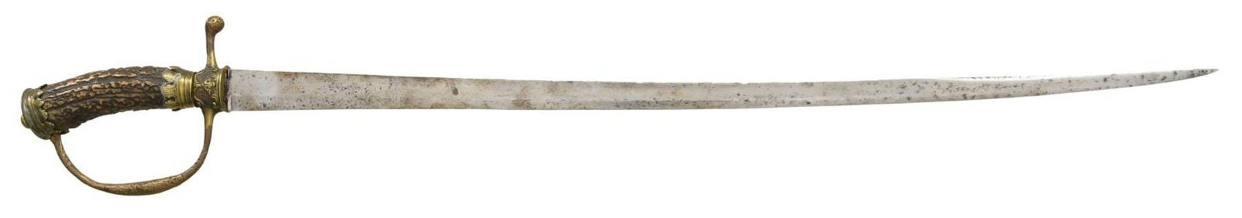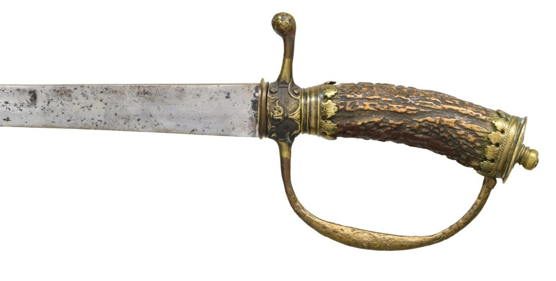 Overall length: 29”. Blade length: 23 7/8”. A good example of an early 19th century hunting sword, likely of Germanic origin. Plain blade with a single medium sized fuller. Gilded brass hilt of simple form but with heavy embellishments. The guard has foliate motifs that extend to the knuckle bow. The ferrule is shaped like a crown, and the pommel cap emulates that pattern. There is a large capstan at the top. The grip is shaped antler. No scabbard. CONDITION: blade has a light gray, cleaned finish. Hilt retains traces of original gilding over the brass. Grip has a filled area opposite the knuckle bow. (02-20100/BF). $300-500.