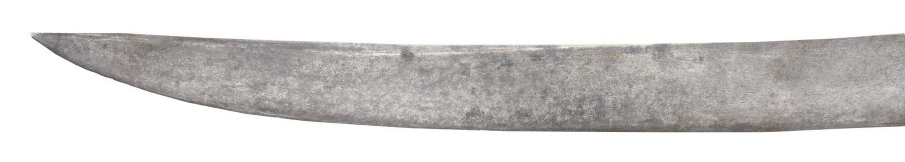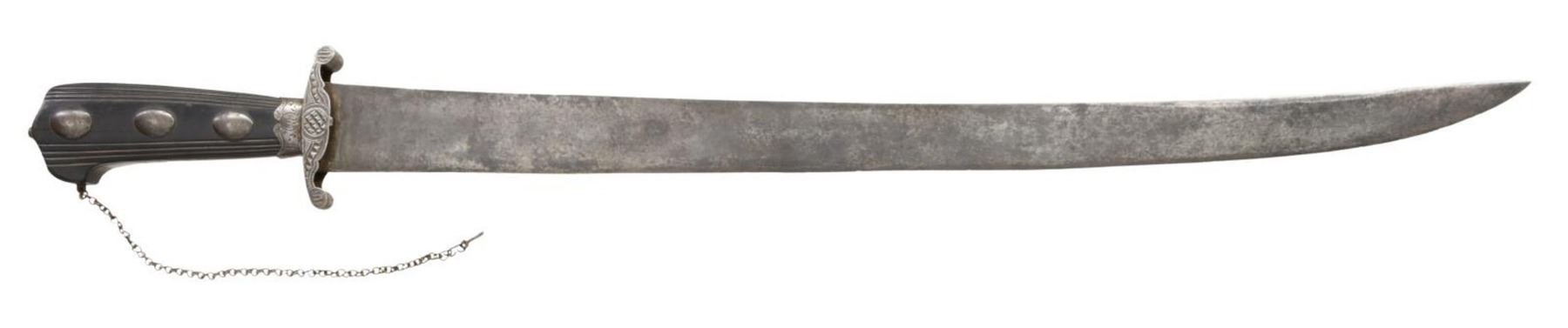 Overall length: 29 1/2". Blade length: 23 1/2". This hunting sword is likely of Germanic origin and dates from the late 18th to the early 19th century. It has a plain, flat, wide blade that has a very slight false edge. The iron guard has 2 bulbous ends with geometric decoration throughout. There is an engraved iron ferrule with a small iron capstan. The 1-piece wood grip has 3 oval iron escutcheons on each side. There is a small iron chain knuckle bow from the top of the grip to the end of one quillon. No scabbard. CONDITION: blade has a medium gray overall patina. Crossguard is loose. Hilt generally shows light to moderate wear with deep patinas. The chain knuckle bow is loose at the crossguard. (02-20101/BF). $400-700.