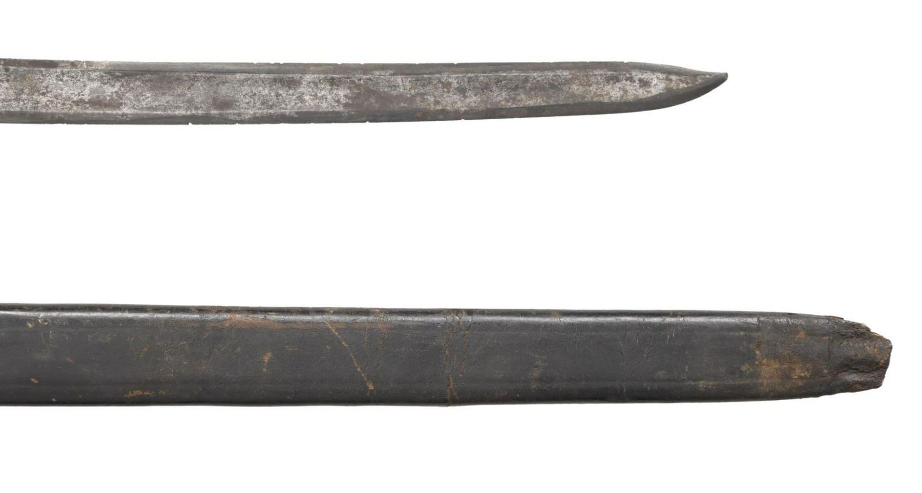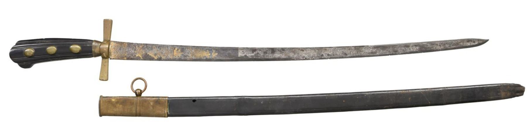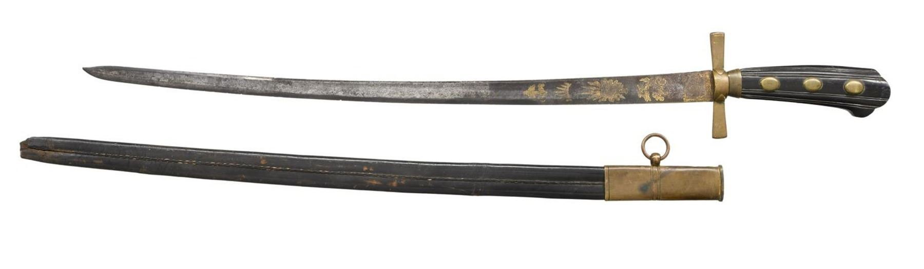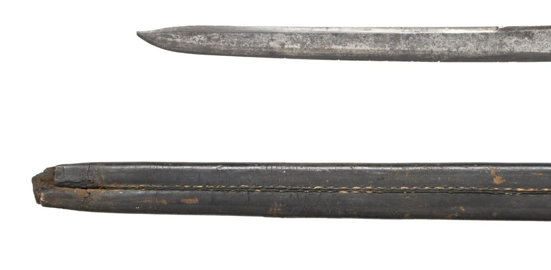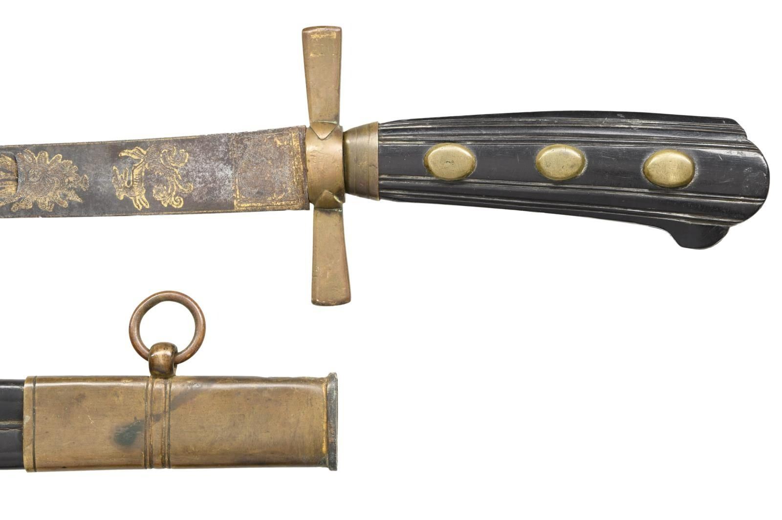 Overall length: 30". Blade length: 21 5/8". This hunting sword is likely of Germanic origin and dates from the late 18th to the early 19th century. The blade has a single wide fuller and has gold highlighted etching on a blued field over 7 1/2” of its length. Etching includes a spray of arms, jumping stag, foliate motifs, geometric motifs, a winged head, and a winged heart. The brass guard is of simple cruciform style. Plain brass ferrule. The 1-piece wood grip has 3 oval brass escutcheons on each side. There is an unassociated partial scabbard with this sword. CONDITION: blade has a medium gray overall patina. Gold & blue decorations are about 75%. Brass has a deep mustard patina. It appears the capstan rivet is missing. The unassociated scabbard is missing its bottom section. (02-20103/BF). $400-600.