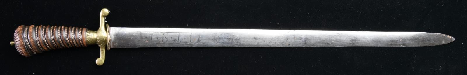 Overall length: 27 1/2". Blade length: 21 3/8”. Plain blade of elliptical cross section, engraved on both sides with the date “.1.6.1.6.”. The sword itself likely dates to the late 18th century and utilizes an earlier family blade. The crossguard & ricasso are brass with engraved petal decoration. One quillon turns down & the other turns up. Large wooden grip with copper wire wrap is topped by a brass capstan. No scabbard. CONDITION: blade has been cleaned & buffed, but the engraving remains substantially clear. Hilt shows light wear overall. Wire is complete. (02-20146/BF). $500-750.