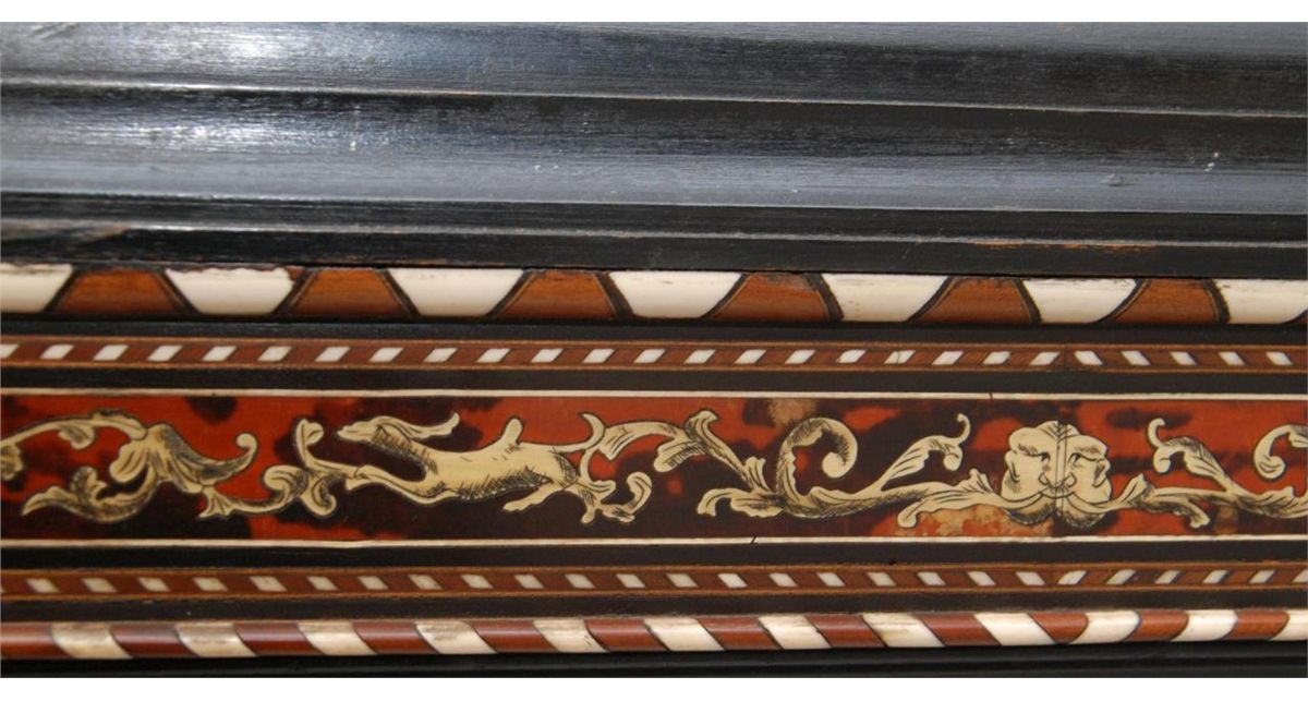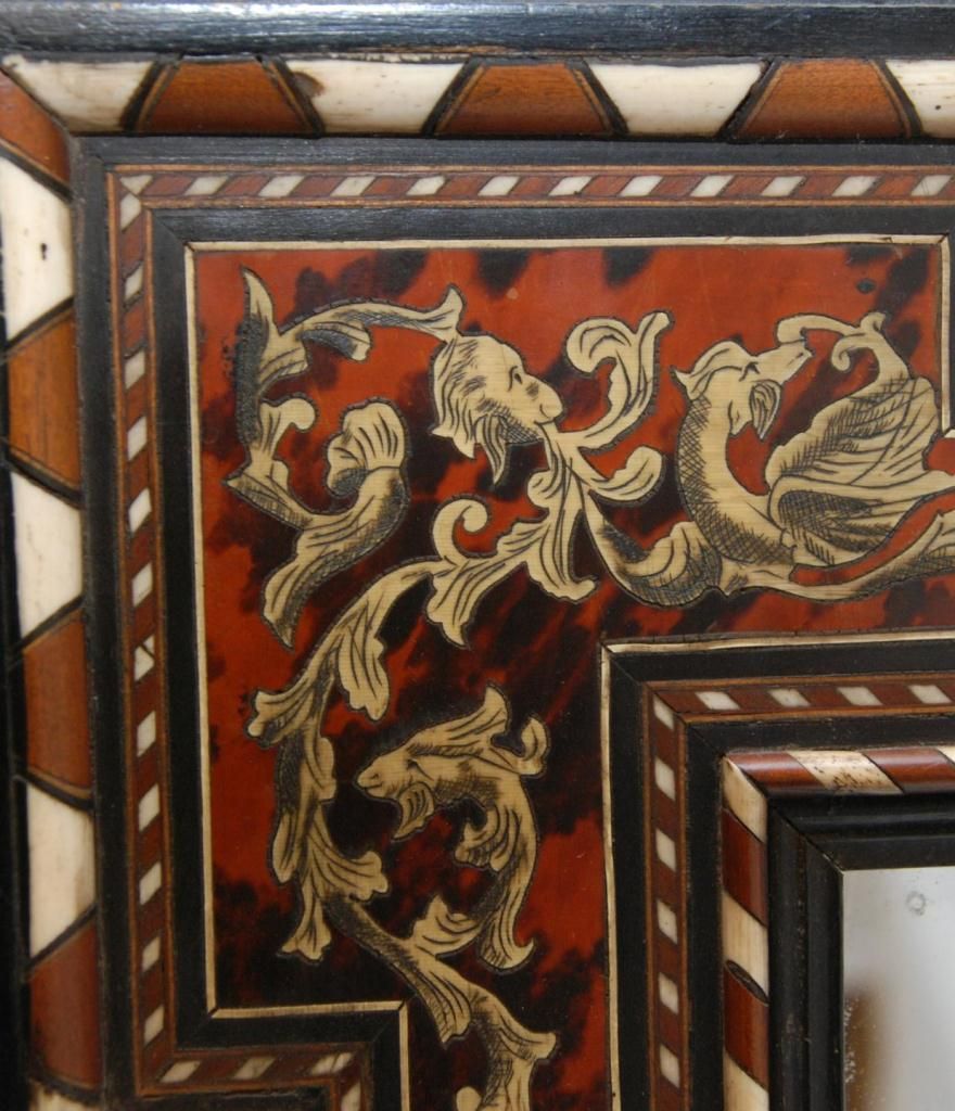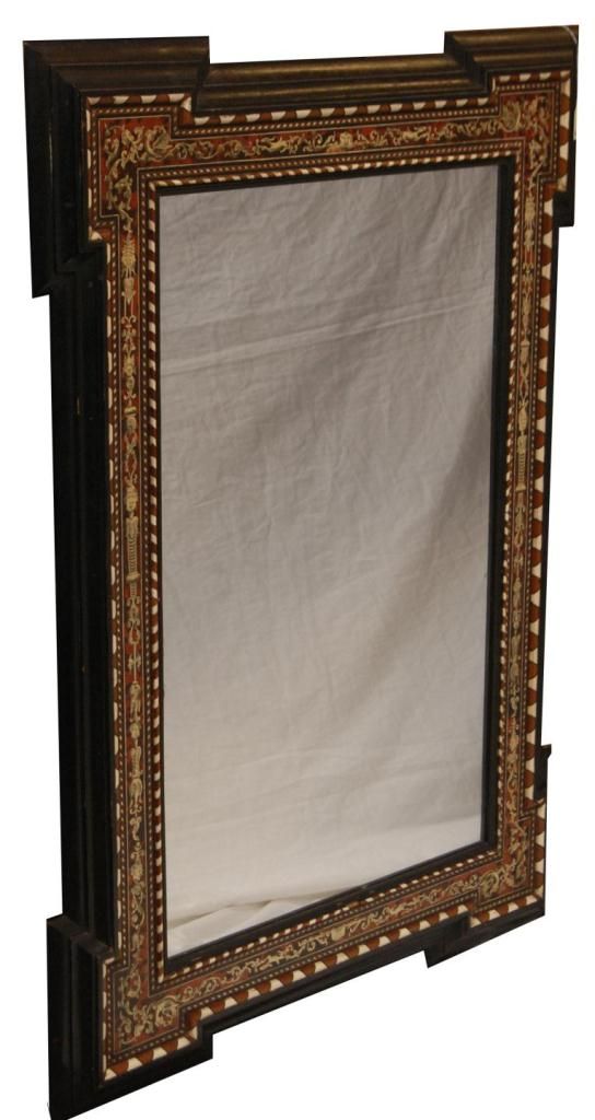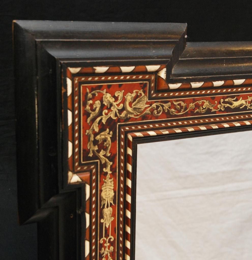 Antique European ivory and tortoise wooden mirror. Has scrolled design with faces. Late 19th century. Measures 46" height x 34" width (116.8cm x 86.3cm).