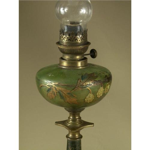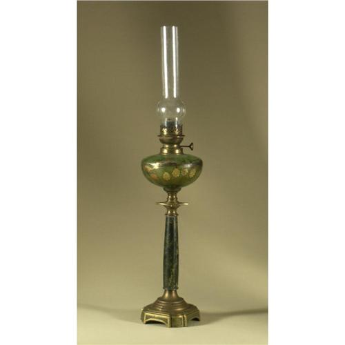 KEROSENE LAMP: A continental kerosene lamp, brass tone column form base, Bohemian hand paited glass well, ''Schuz-Markt'' glass shade, 29'' high with shade, 19'' base, patination commensurate wtih age, late 1800's-early 1900's.