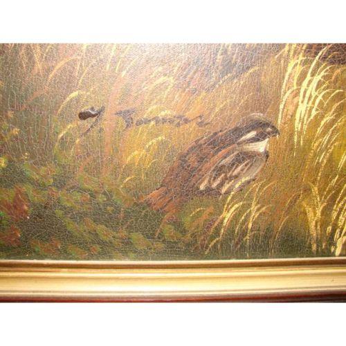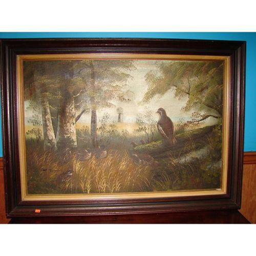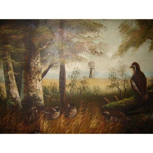 EUROPEAN LANDSCAPE PAINTING. Oil on canvas. Depicts a group of bobwhite quail in the foreground with a windmill in the background. Signed in lower right “T. Jamas”. 30.5” x 43” framed. 24.25” x 36.25”.