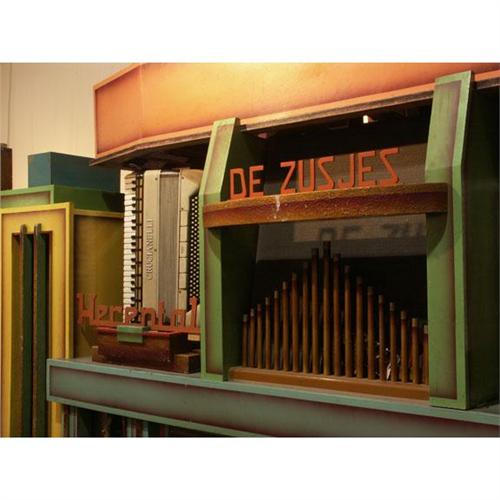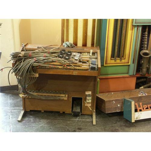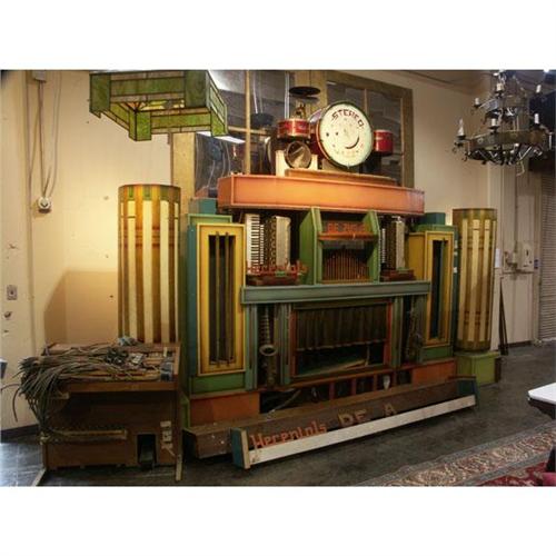 BAND OR FAIRGROUND ORGAN: Mechanical band organ played by a system of musical card books vs roll music, no keyboard involved. These were often found in roller rinks, at fairgrounds, Oktoberfest events and even Bioscope shows in the 1920's. This band organ is from Belgium, measures 14' wide and 11' high not uncluding support equipment, Circa 1940?, sold as seen with about 16 boxes of card music. Please call for shipping quotes.
