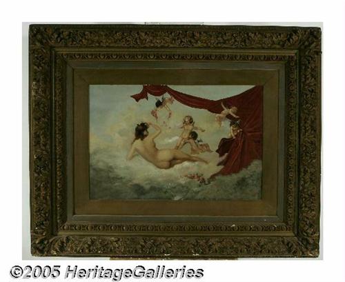 <B>EUROPEAN SCHOOL</B></I><BR>Venus in the Clouds with Cupids<BR>Oil on canvas<BR>20in. x 30in.<BR>Signed 'W Riels '92' lower right<BR><BR>Condition report: old lining, minor inpainting in curtain, sky around the Cupids and on the back/hip area of nude figure<BR>