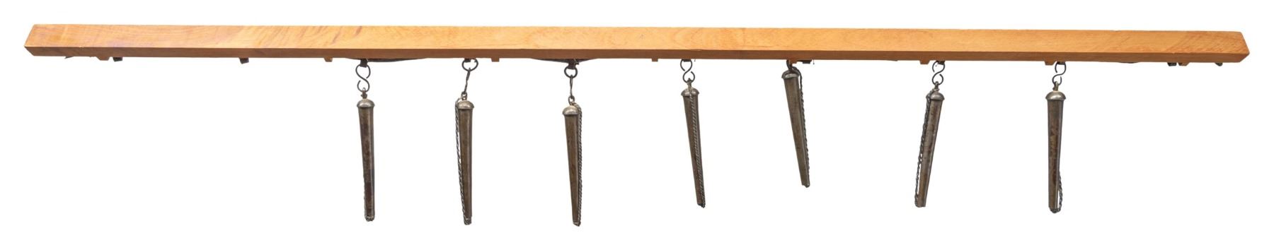 Leather belt measures approx. 54" has 10 floral clamps that can hold small flasks. Belt has 7 iron powder charge cone flasks with cork plugs having cord retainers. Belt is held in place on 57" board. CONDITION: belt shows cracking, mildew stains, flexing & broken 15" from tip. Iron shows corrosion with intact cords & cork plugs. PROVENANCE: Estate Collection of Nicholas Apergis. (02-24795/MD). NON-GUN. $400-600.