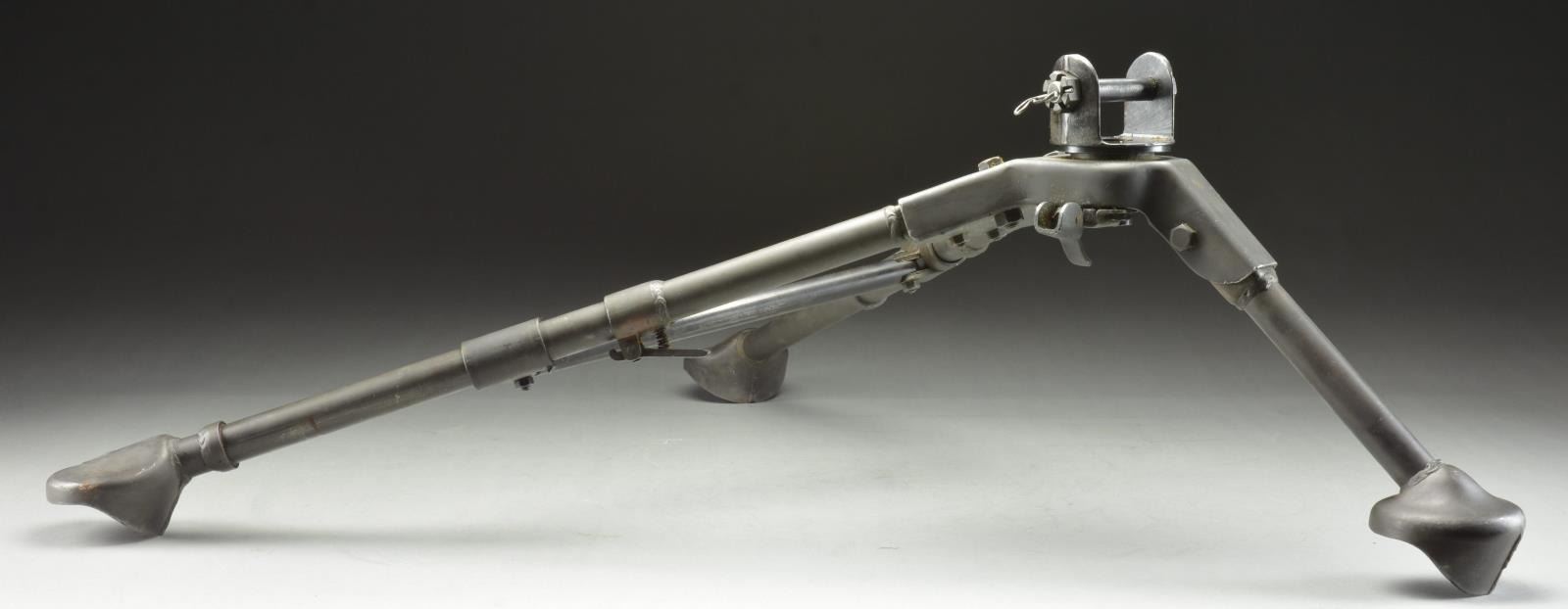 A nice example of an original Evans M2 folding tripod. These are a lightweight and rugged tripod for your 1919 or home project. Complete w/ front pintle. No T&E mechanism. CONDITION: Parkerized finish. All folding parts move freely. Engraving on T&E bar are clear & easy to read. (02-17800/JZ). $300-450.