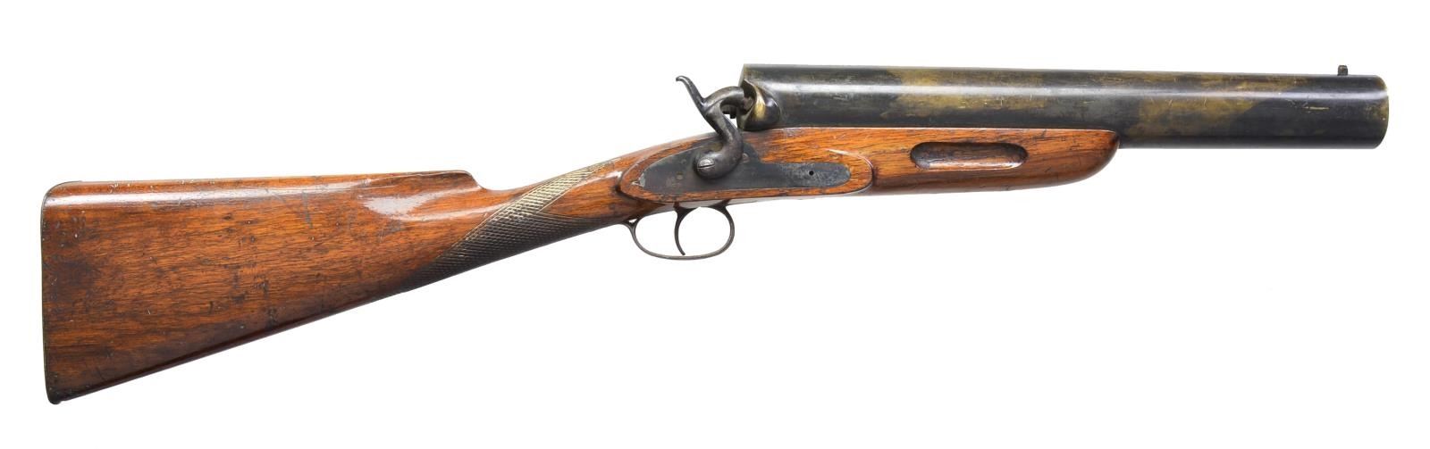 GUN. Cal. 1 1/2" bore. NSN. Bbl. 14 7/8”. A very interesting ship board line throwing gun used to throw lines ashore or to other ships. This type of gun was used beginning around 1840. Brass bbl. has an engraved mark at the top that reads, “Evans & Low’s Patent No. 21”. Percussion lock. Iron trigger guard & buttplate. Stock has a checkered wrist & finger rails in the forestock. CONDITION: bbl. has a deep ancient patina. There is a slight dent at the side of the muzzle & the rear sight is missing. Lock holds both full & half cock. Stock shows normal wear & tear w/ a tiny piece missing at the base of the butt. (01-17436/BF). ANTIQUE. $800-1,200.