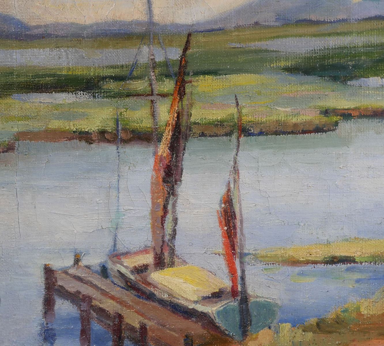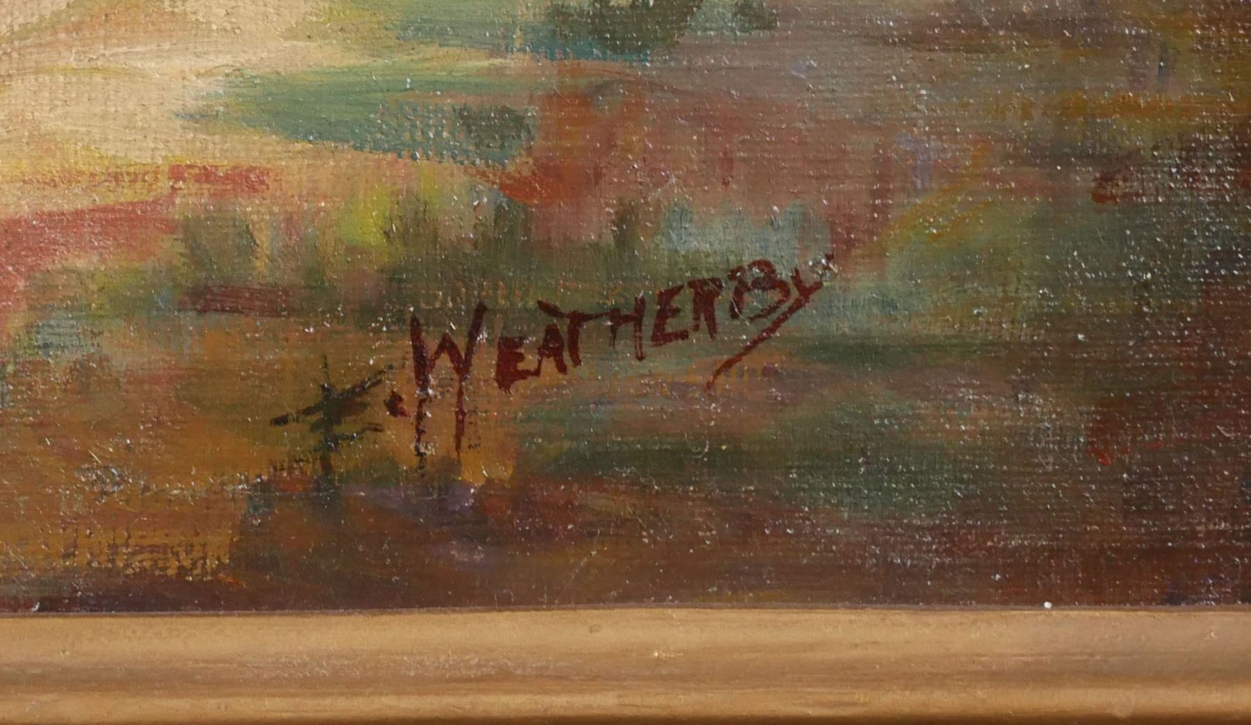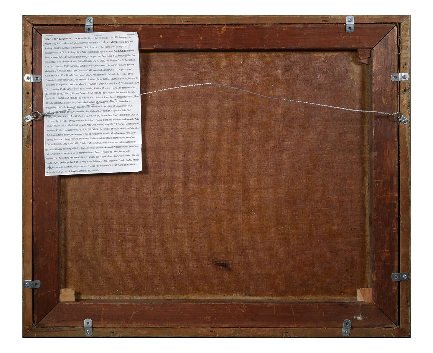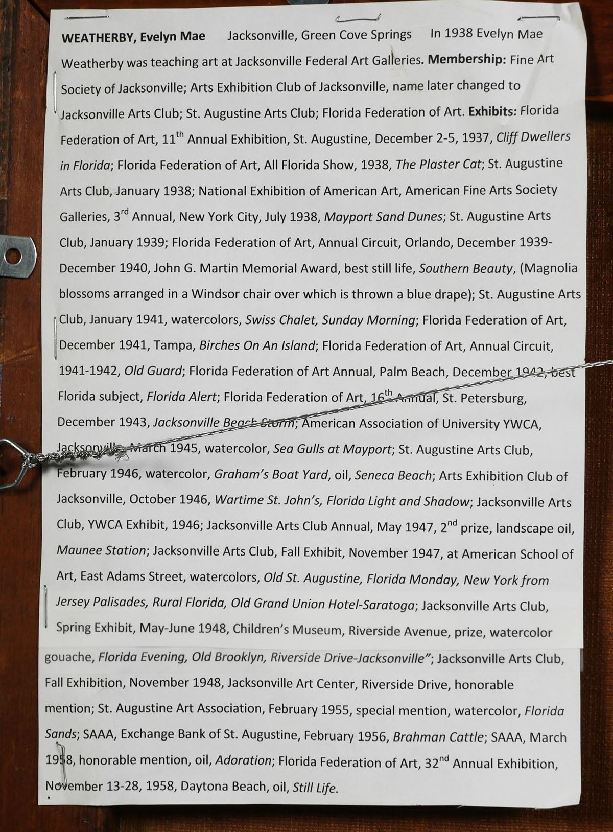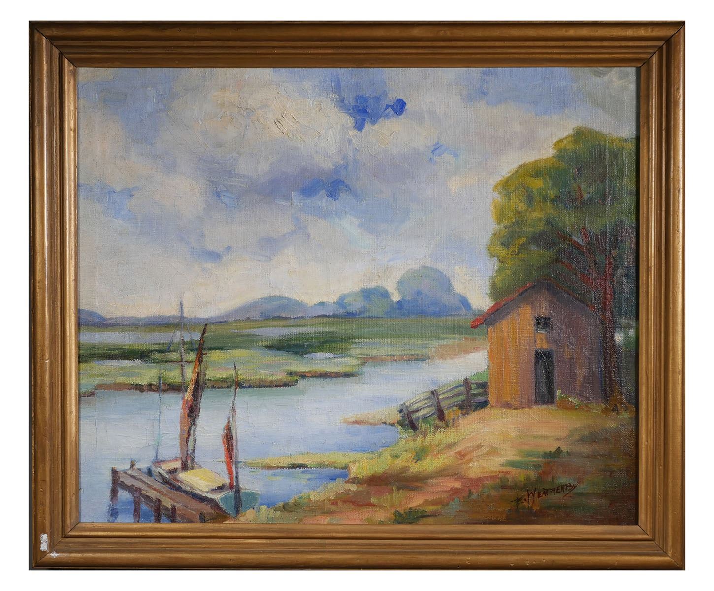 Oil on canvas painting of a Florida wetland with small house and boat. Signed E. Weatherby at lower right for Evelyn Mae Weatherby. She was a teacher at the Jacksonville Federal Art Gallery in the 1930s and was active in Jacksonville and St. Augustine. Very good condition with craquelure throughout. Canvas measures 24" x 20". Framed size is 26" x 22".