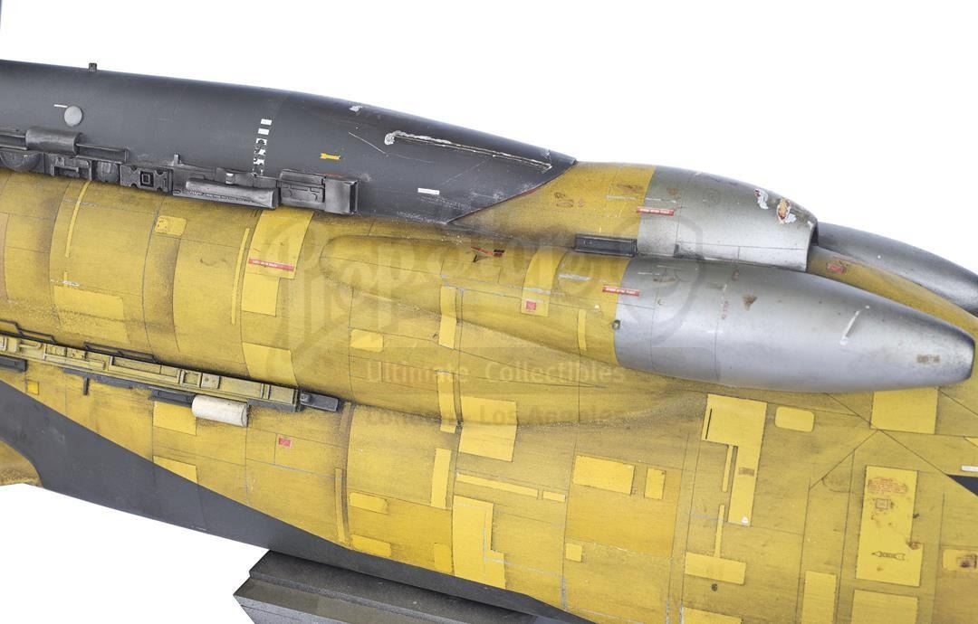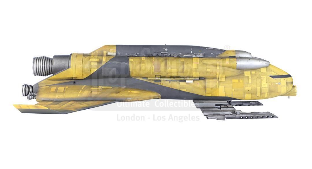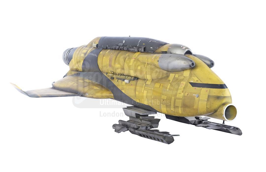 This lot consists of a yellow, grey and metal-coloured resin spaceship with a series of rear thrusters, a pair of wings with decorative winglets, white lettering and a circular port on the nose cone where it could be affixed to the station model. It is in excellent overall condition with some deliberate weathering throughout, as well as signs of wear from production including paint chipping on the hull and nose cone port accent. Dimensions: 106.75 cm x 48.25 cm x 28 cm (42" x 19" x 11")
