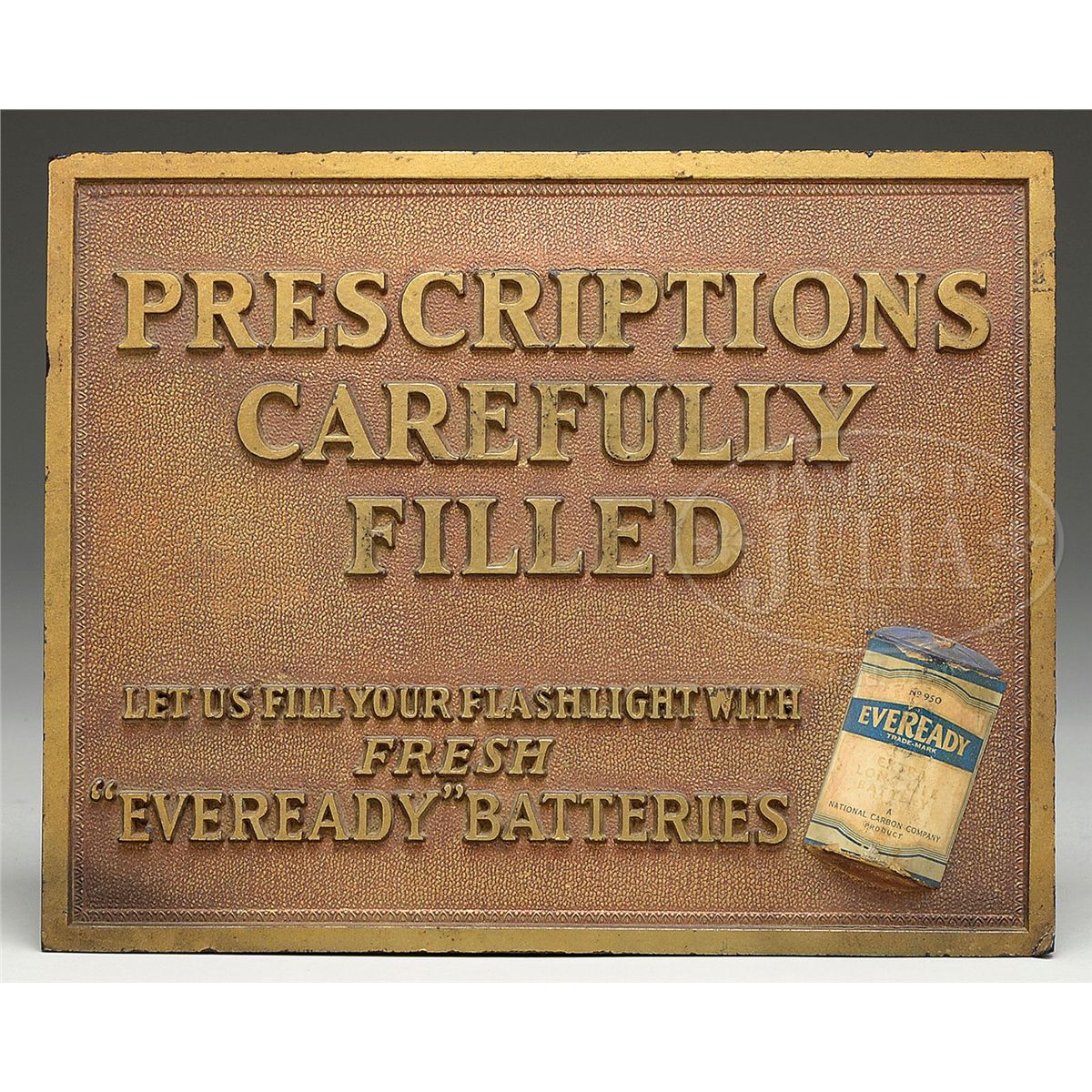 Easel backed composition embossed sign which would have been located by the drug store pharmacy department which reads "Prescriptions Carefully Filled / Let Us Fill Your Flashlight With / Fresh / "Eveready" Batteries". SIZE: 10-1/4" w x 8-1/4" t. CONDITION: Good to very good. 1-13210