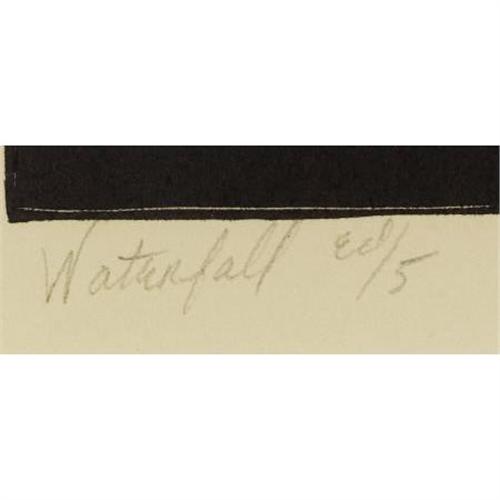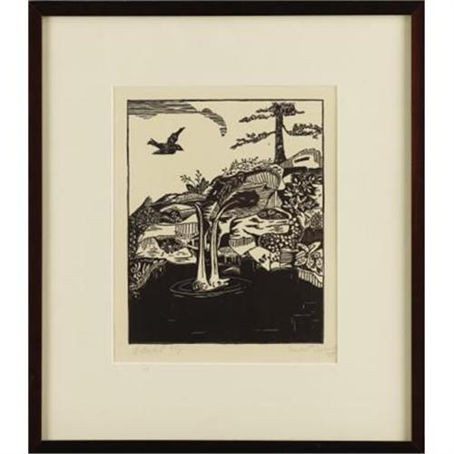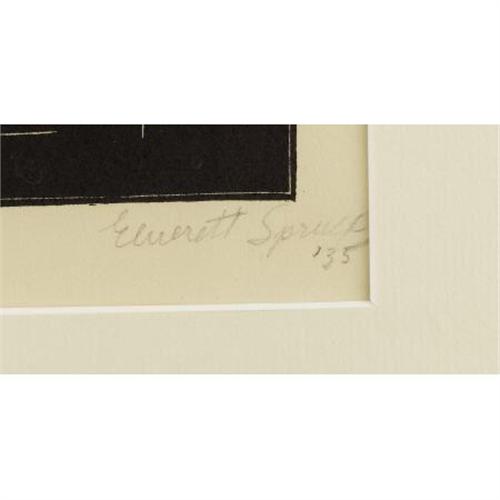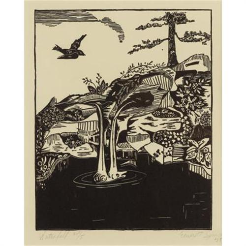 <B>EVERETT SPRUCE (1908-2002)</B></I><BR><I>Waterfall</B></I>, 1935<BR>Woodblock print on paper<BR>10 x 8 inches (25.4 x 20.3 cm)<BR>Signed and dated lower right<BR>Titled lower left<BR><BR> A rare Spruce print with a small edition size of five.<B>Condition Report:</B> Excellent condition. New frame in excellent condition.<BR><BR><b>Shipping:</b> Requires 3rd Party Shipping (<a target="_blank" href="http://www.heritageauctions.com/common/shipping.php">view shipping information</a>)
