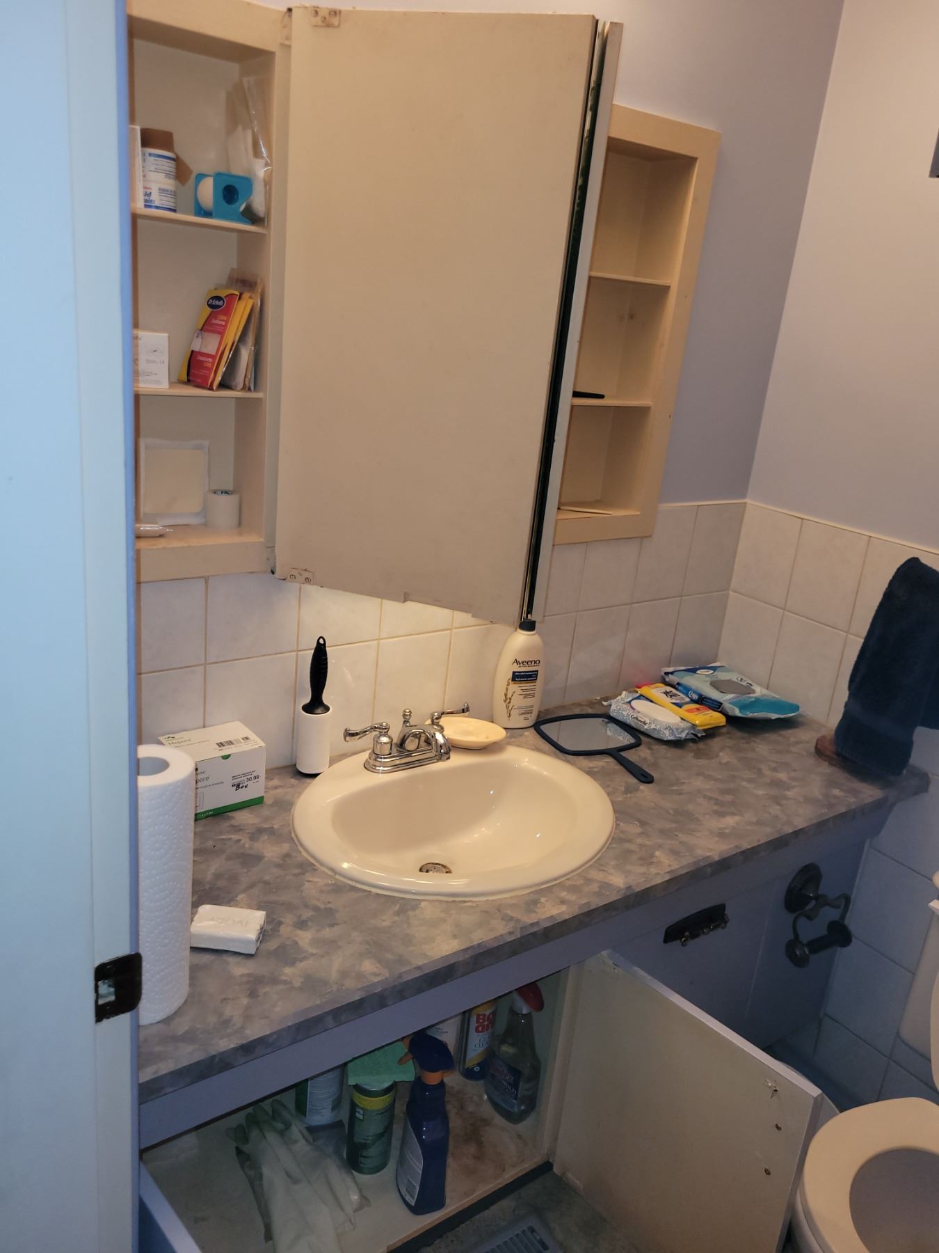 YOU WILL RECEIVE EVERYTHING IN THE BATHROOM: CUPBAORDS BELOW, DRAWERS,COUNTERTOP, INSIDE MEDICINE CABINET AND ALL DECOR. SEE PITCTURES.