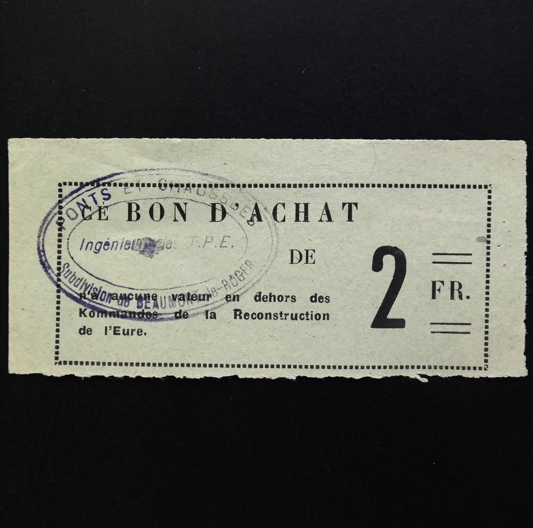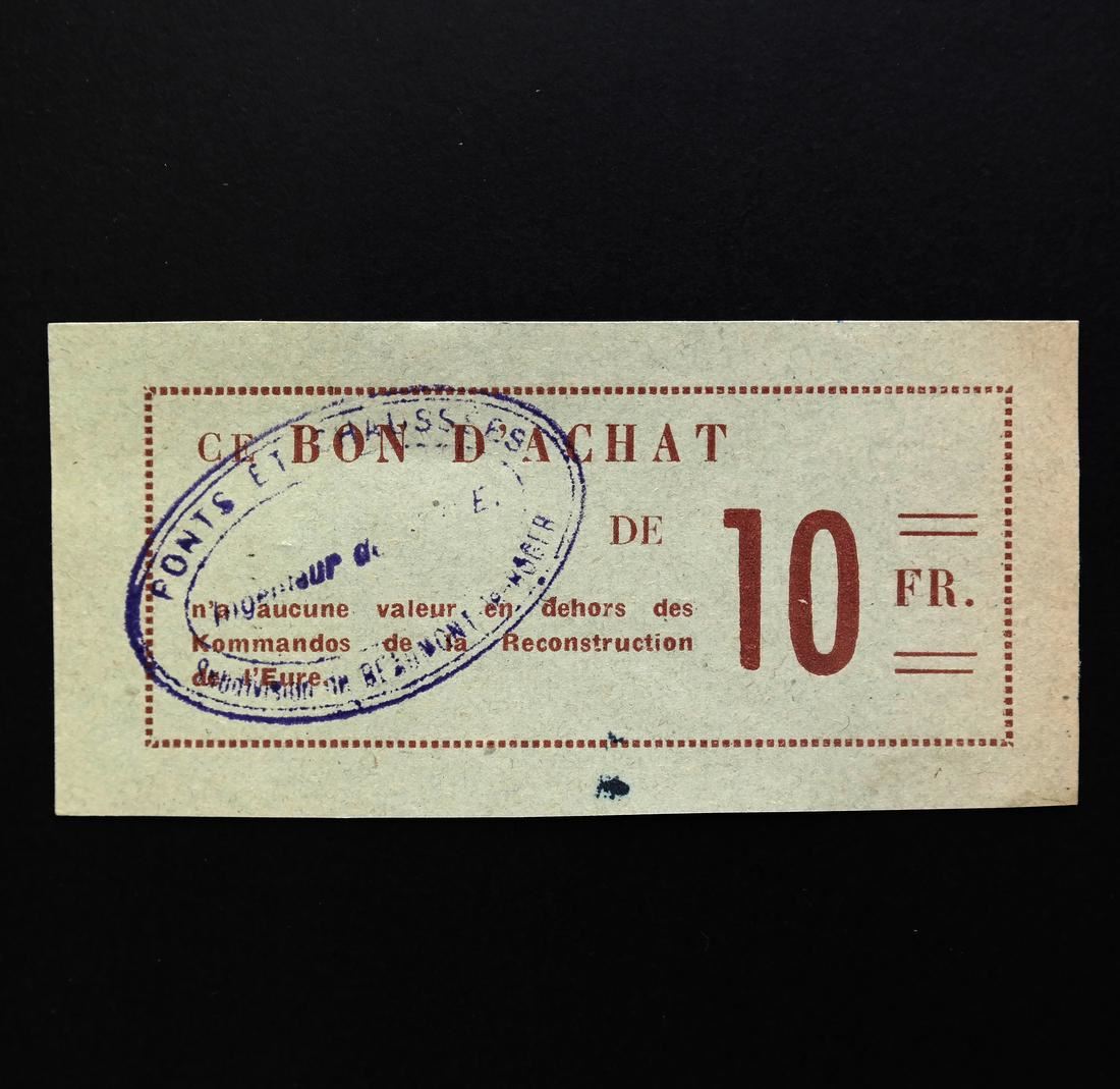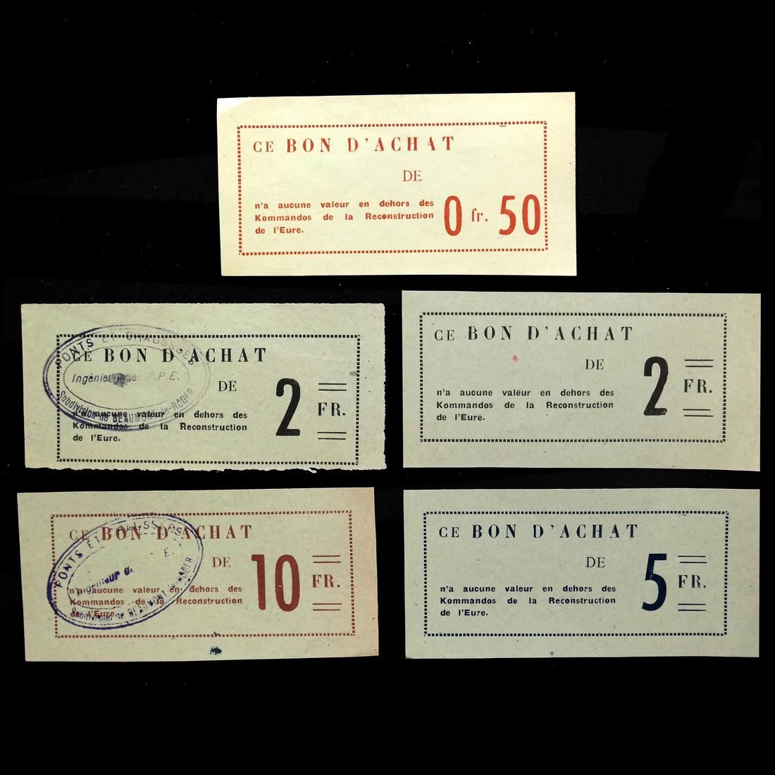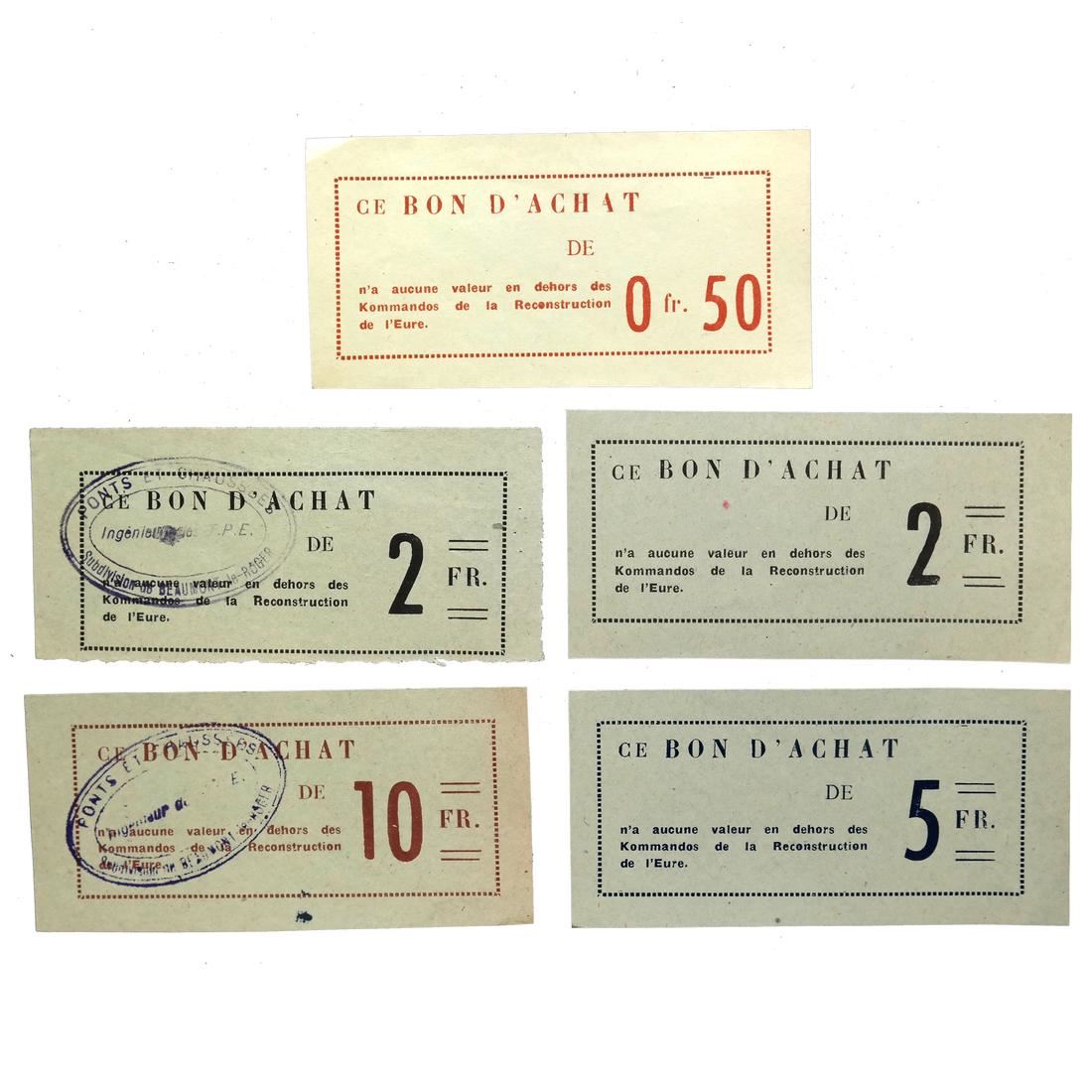 Ce Bon DAchat / na aucune valeur en dehors des Kommandos de la Reconstruction de lEure 50c, 2Fr (2), 5Fr and 10Fr notes, one 2Fr and the 10Fr handstamped Ponts Et Chaussees / Ingenieur des T.P.E / Subdivision du Beaumont-le-Roger, sound and XF.