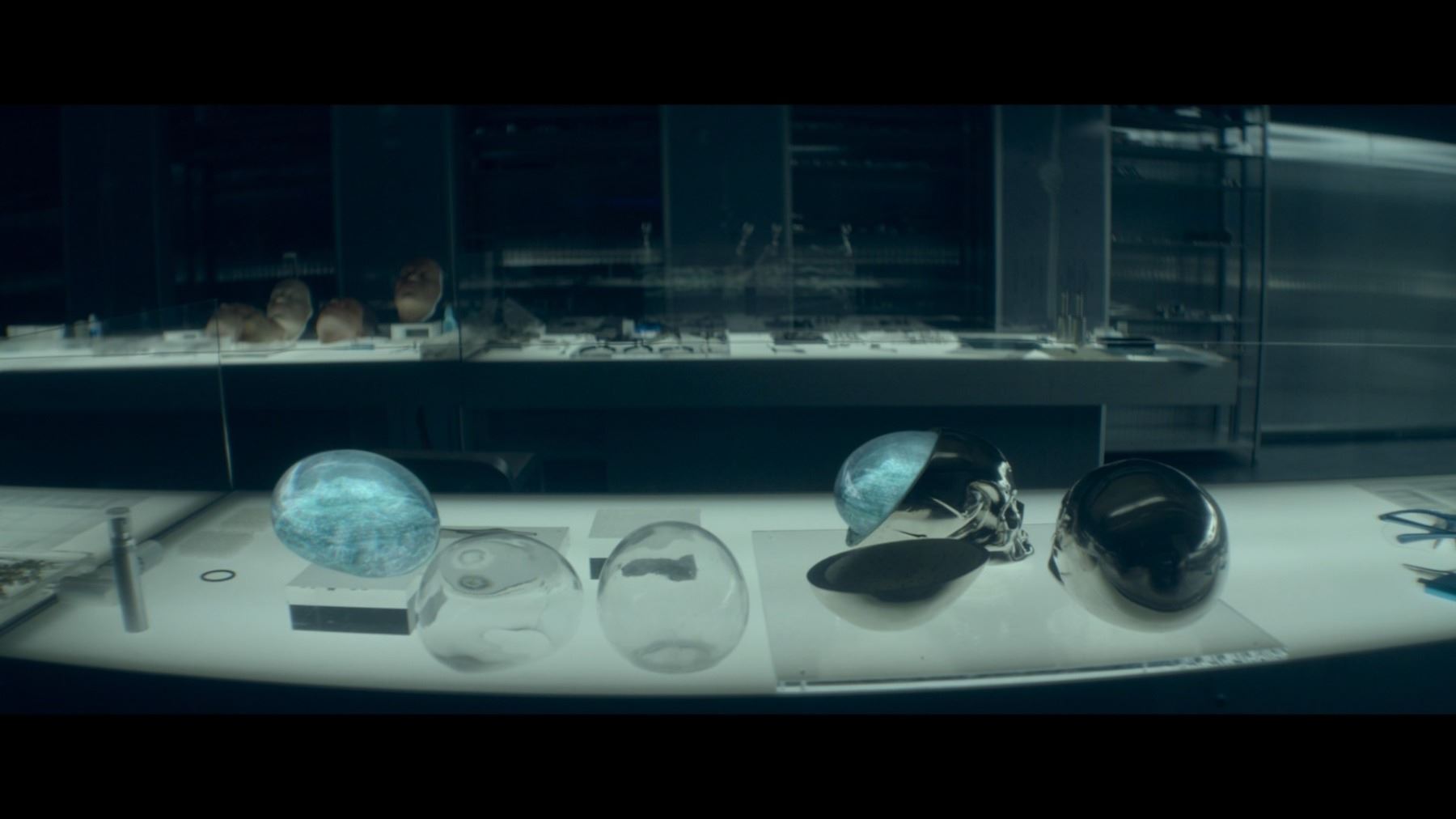 Ava's (Alicia Vikander) humanoid A.I. skull from Alex Garland's sci-fi thriller Ex Machina. Skulls were among the array of robotic components displayed in Nathan's (Oscar Issac) high-tech laboratory, where the highly intelligent android Ava was built.