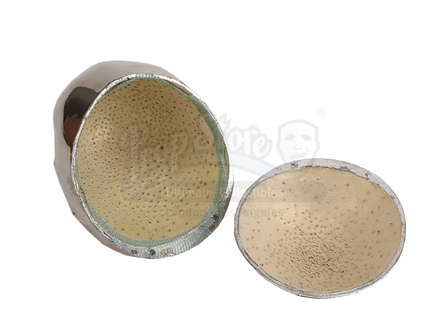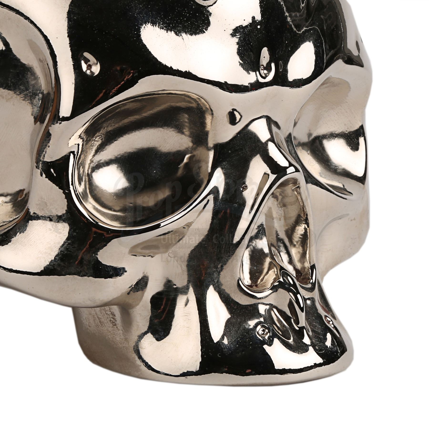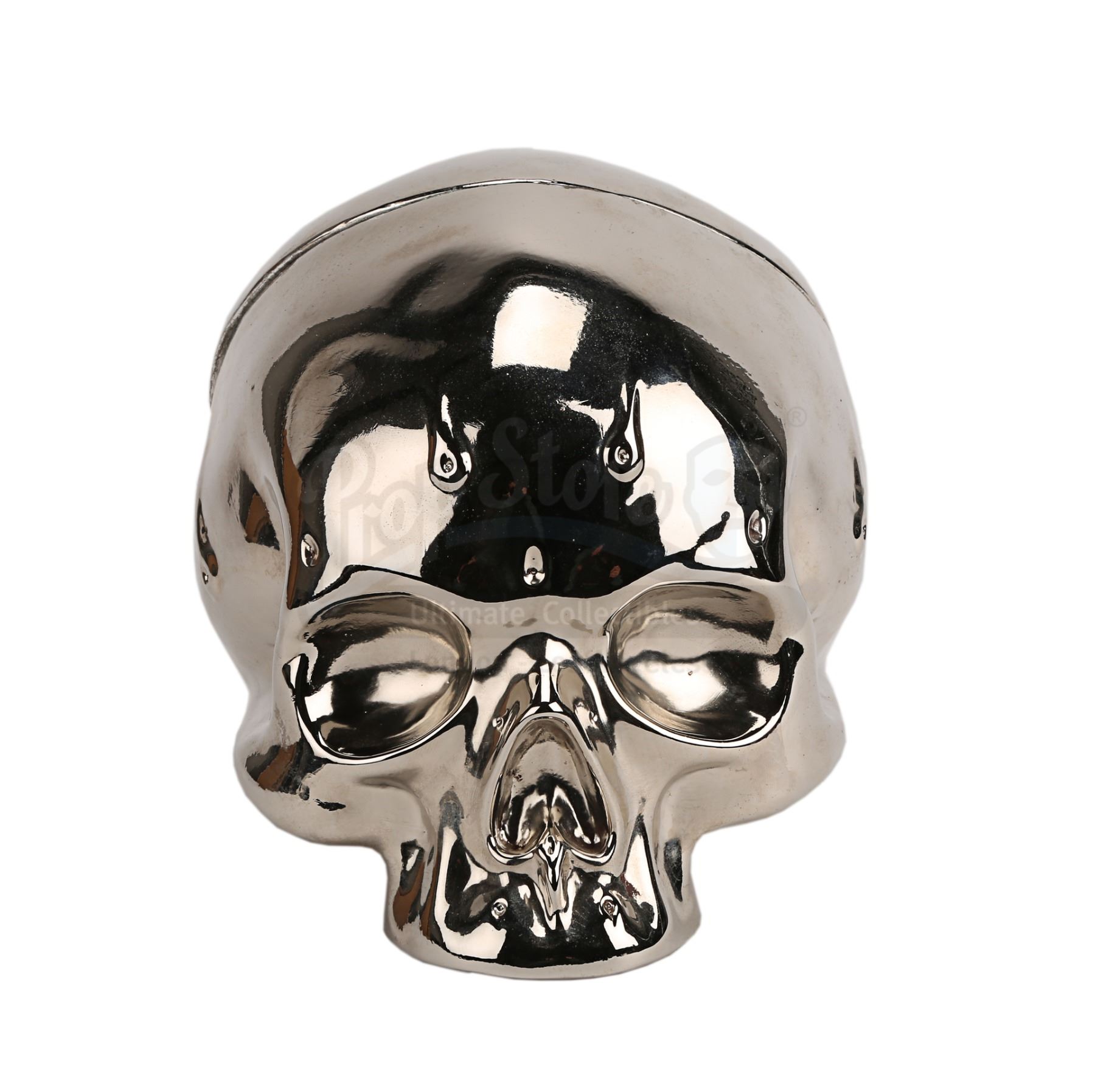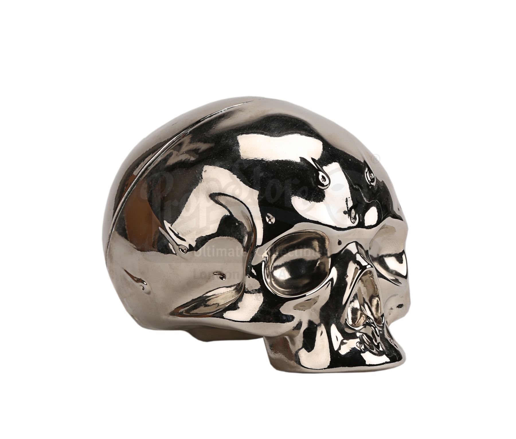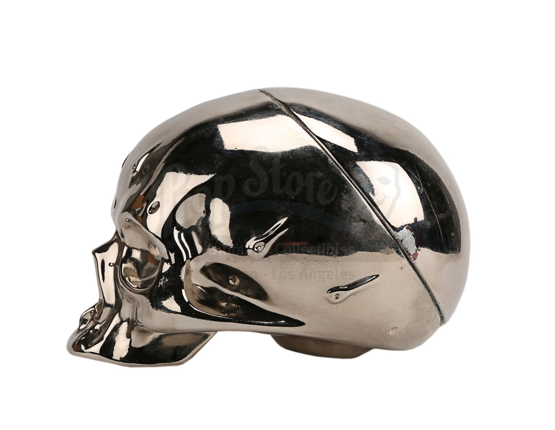 Featuring a faux-silver chrome finish, the skull is made of resin and displays a detachable cap. The inside of both components feature a beige, iridescent tissue lining covered with small silver-coloured beads, and a strip of metallic green netting is adhered to the top edge, where the cap attaches. The skull displays signs of wear from production use, including minor surface scratches, and a piece of the chrome finish has chipped away on the cap, exposing the resin underneath. Dimensions: 19 cm x 15 cm x 14 cm (7 1/2" x 6" x 5 1/2")