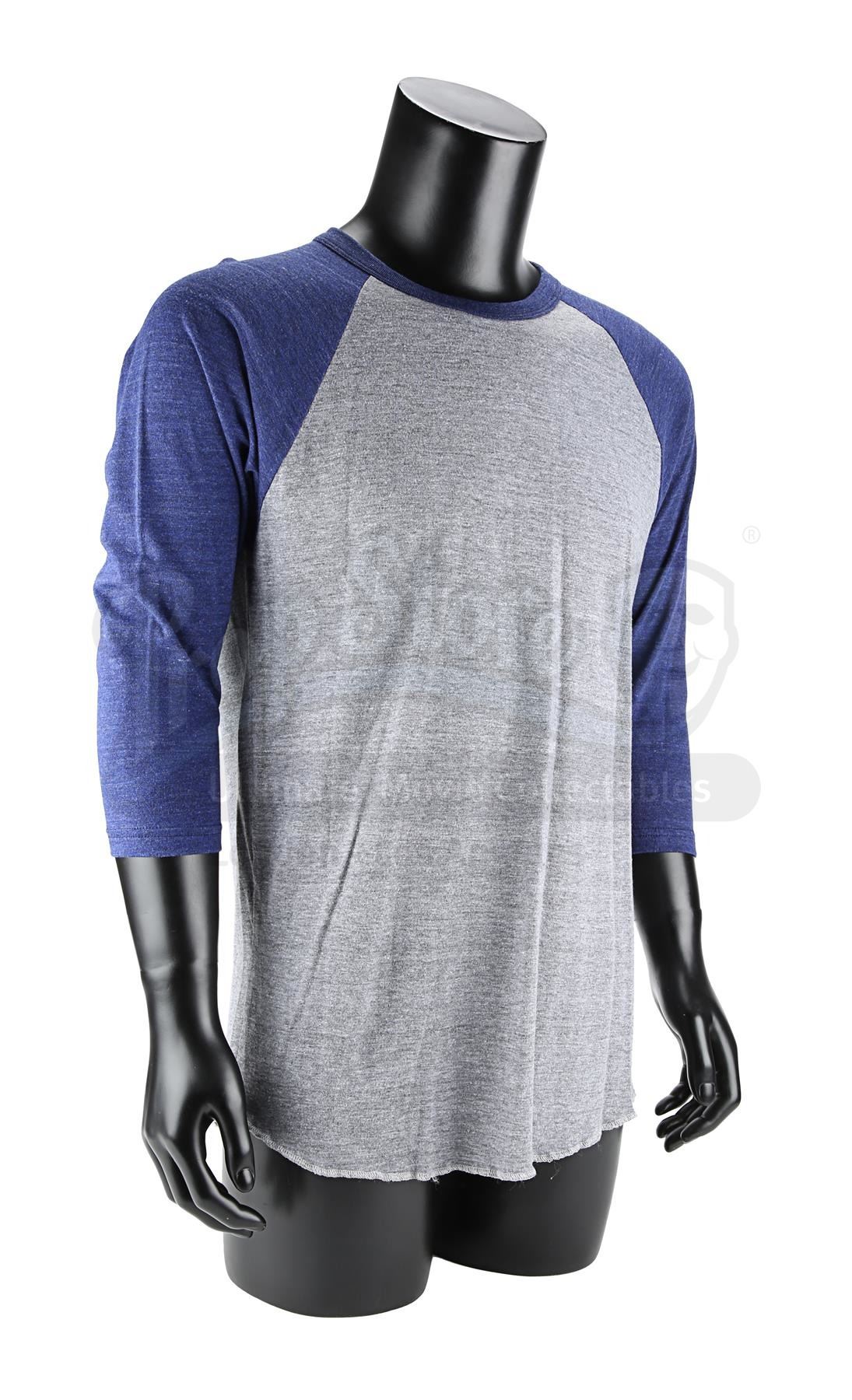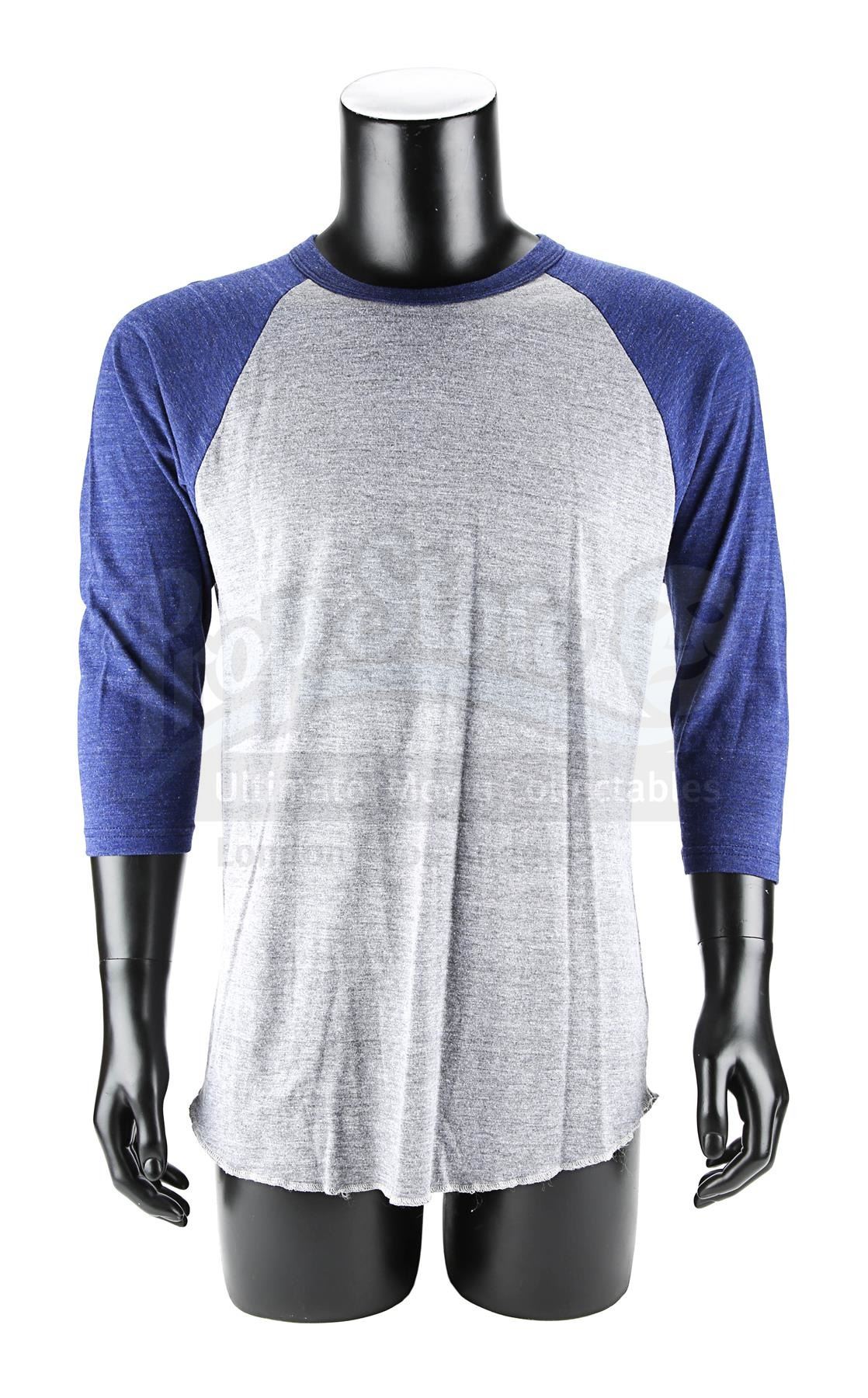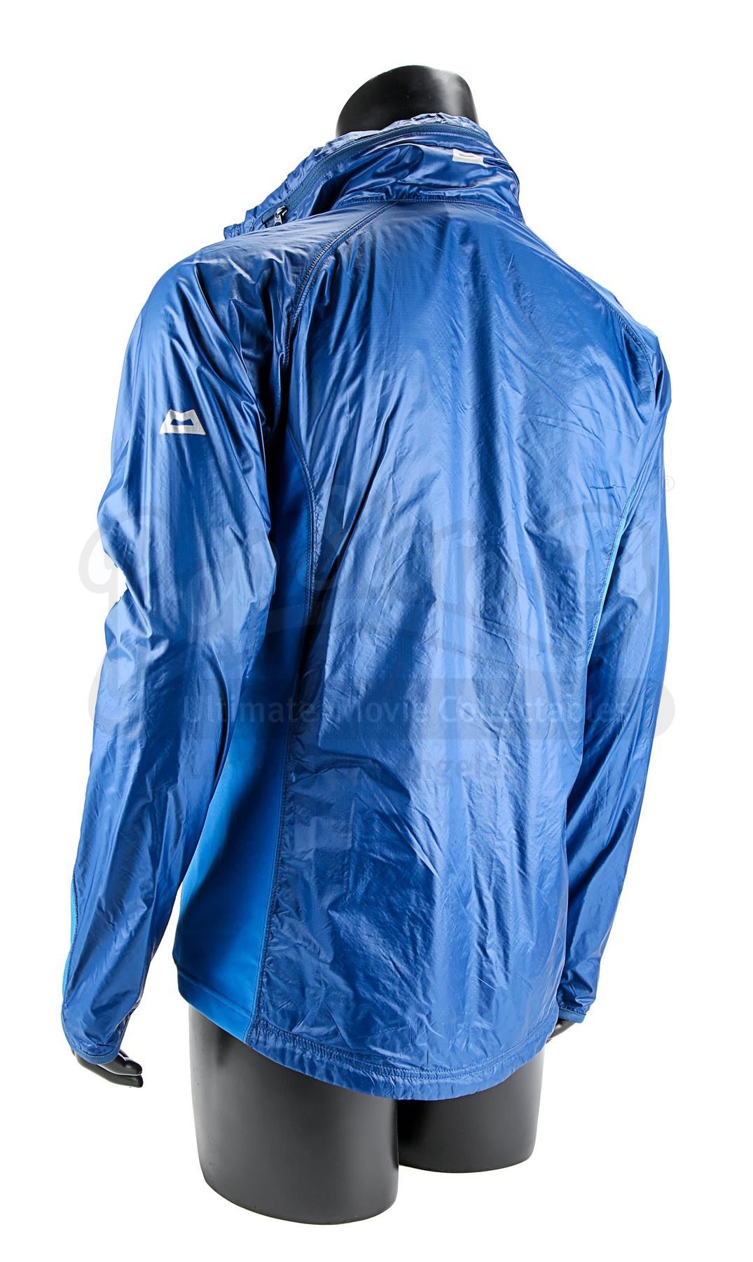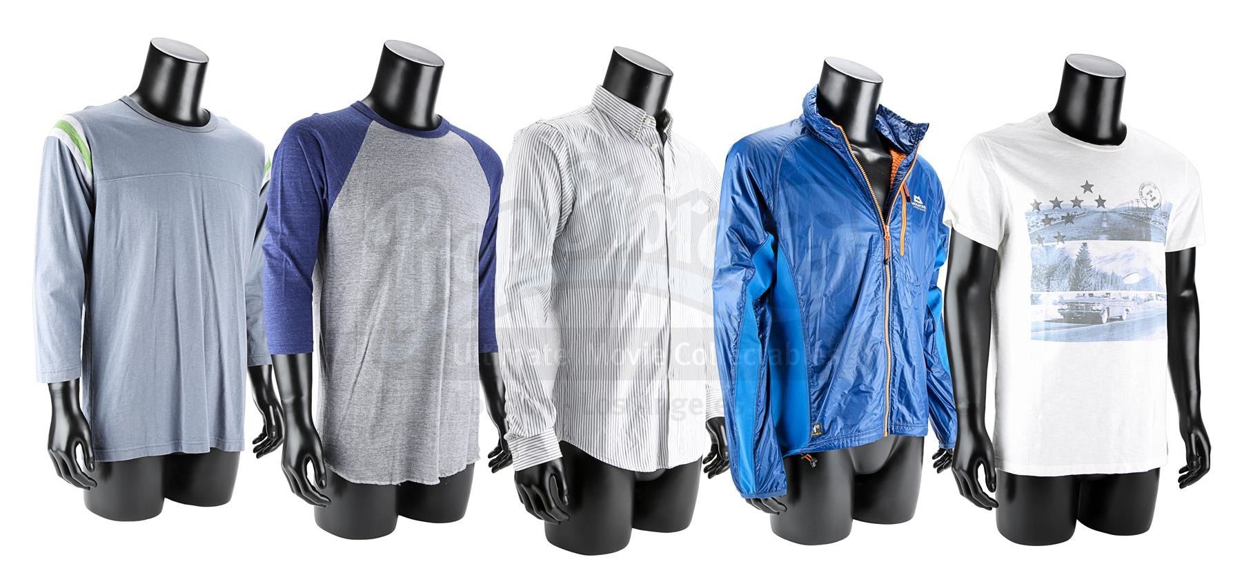 The lot consists of a blue Mountain Equipment raincoat with a bright orange zip running down the front (size medium); a white cotton striped shirt (size small); a white Gap graphic t-shirt (size medium); a grey long-sleeved shirt with green striped detailing on the sleeves (size large); and a grey raglan top with blue sleeves (size medium). The costume set shows minor wear from production use.