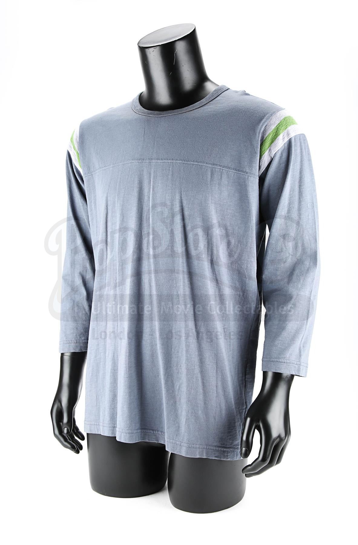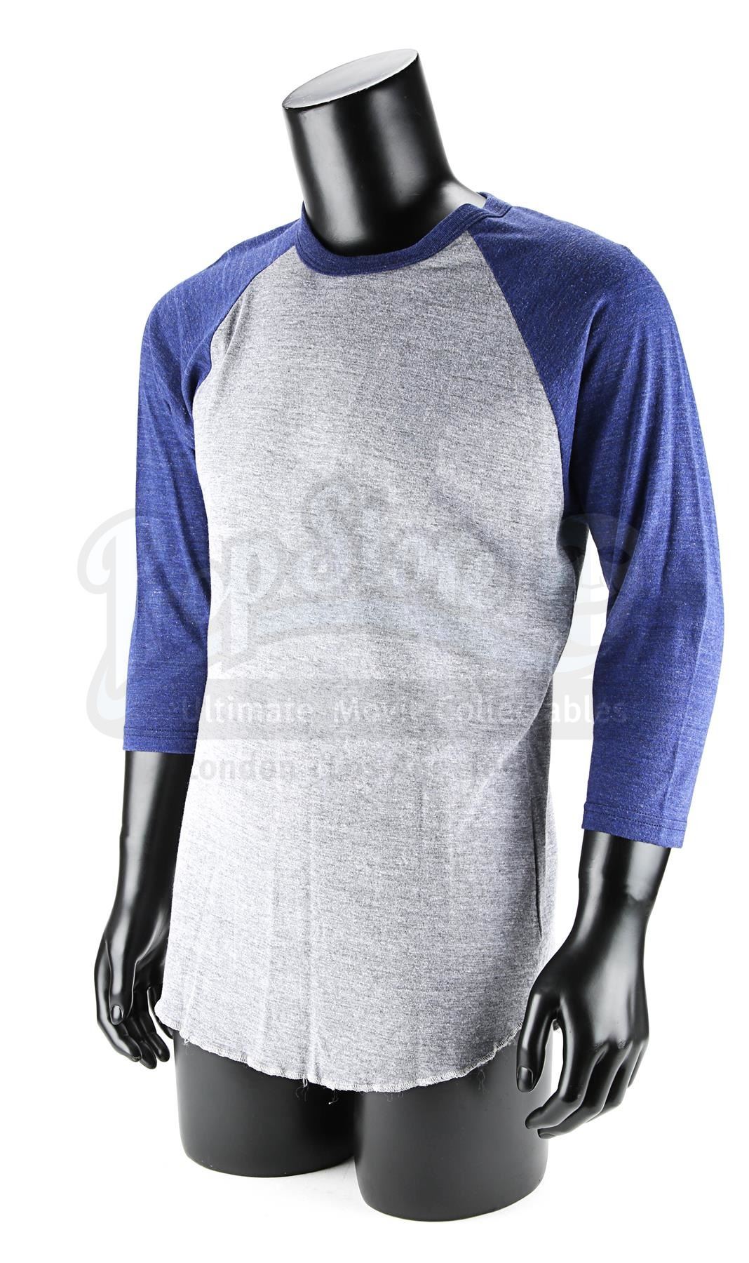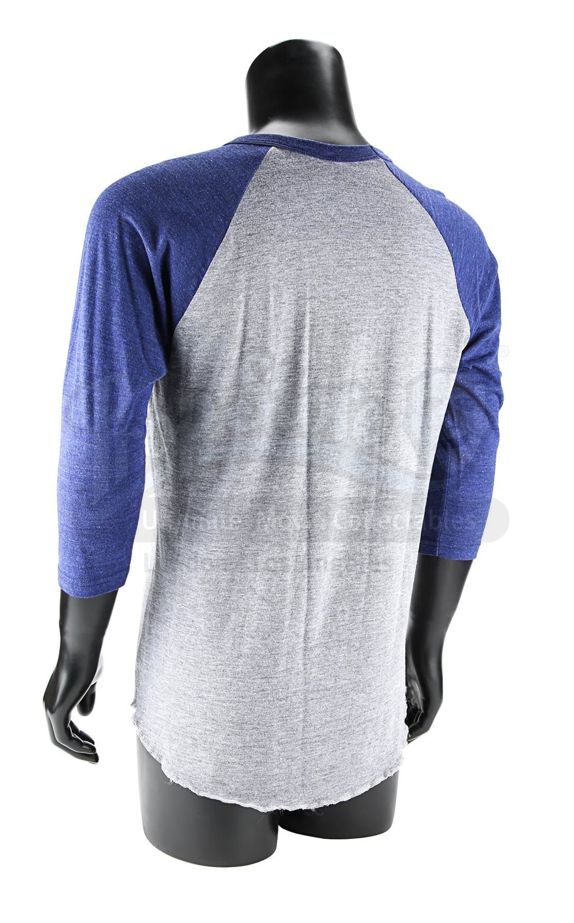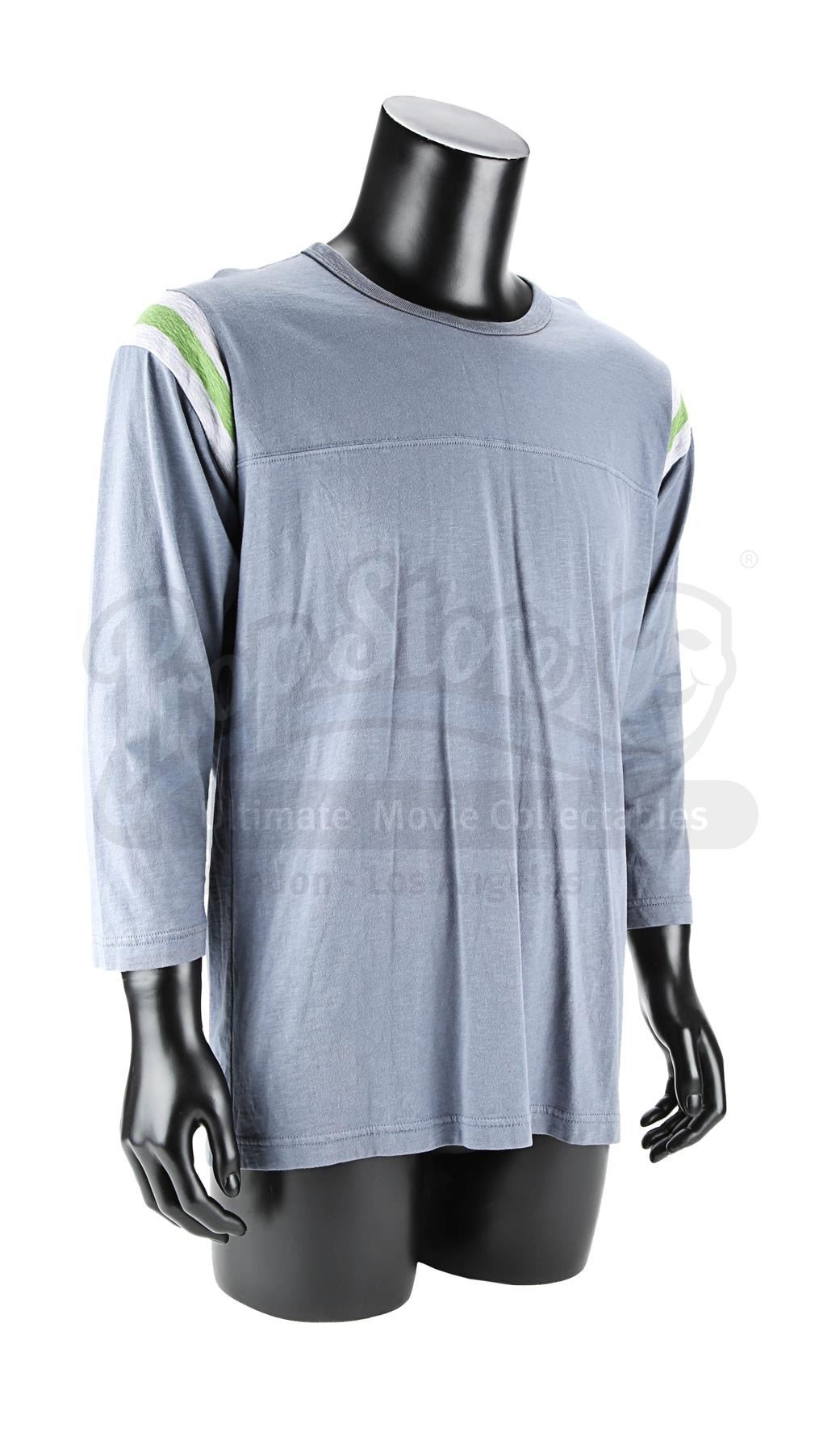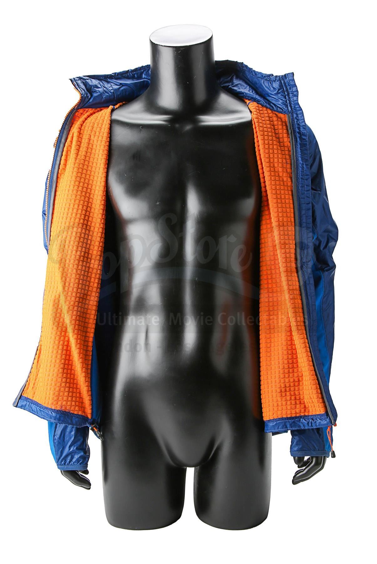 The lot consists of a blue Mountain Equipment raincoat with a bright orange zip running down the front (size medium); a white cotton striped shirt (size small); a white Gap graphic t-shirt (size medium); a grey long-sleeved shirt with green striped detailing on the sleeves (size large); and a grey raglan top with blue sleeves (size medium). The costume set shows minor wear from production use.