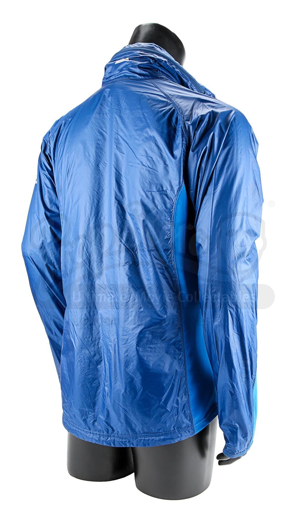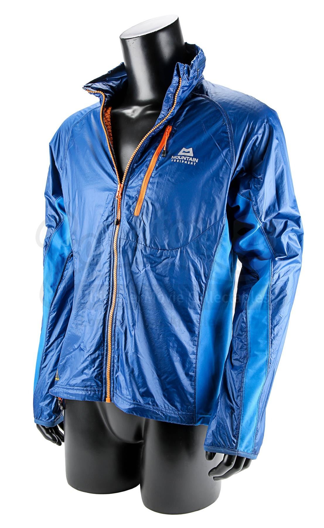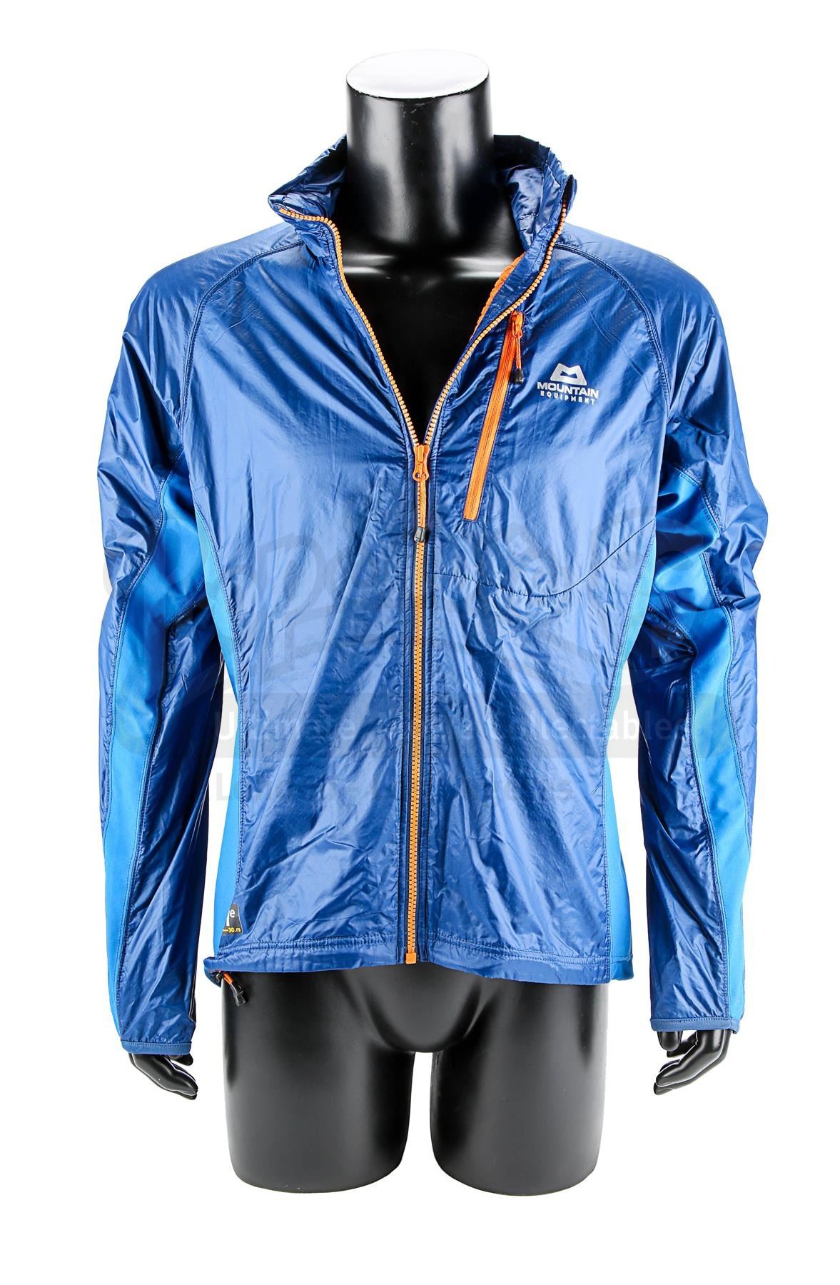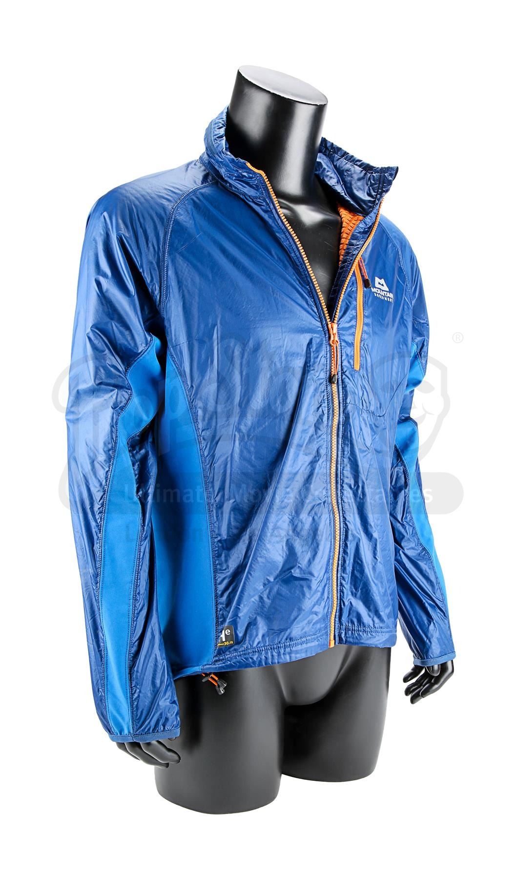 The lot consists of a blue Mountain Equipment raincoat with a bright orange zip running down the front (size medium); a white cotton striped shirt (size small); a white Gap graphic t-shirt (size medium); a grey long-sleeved shirt with green striped detailing on the sleeves (size large); and a grey raglan top with blue sleeves (size medium). The costume set shows minor wear from production use.