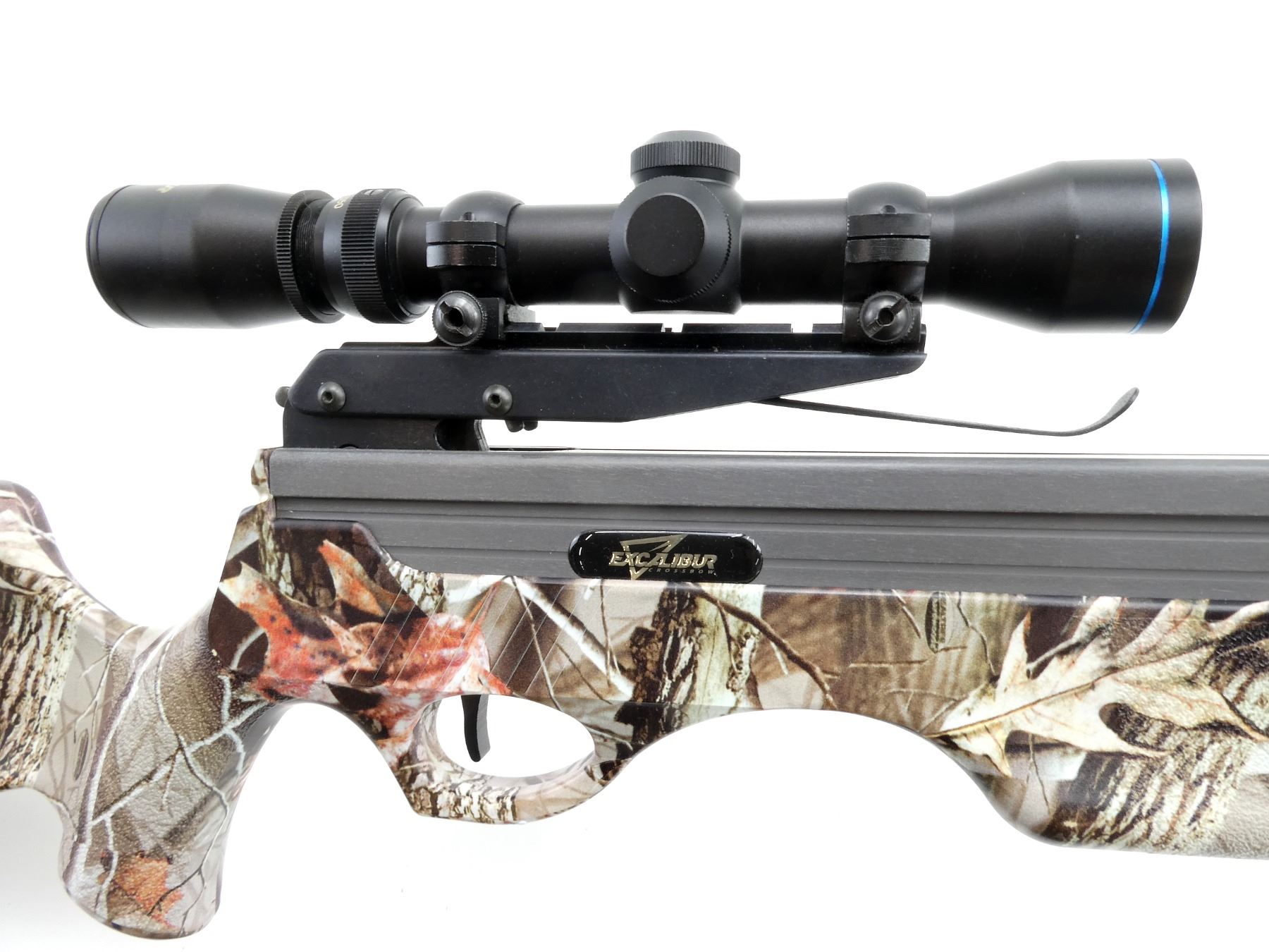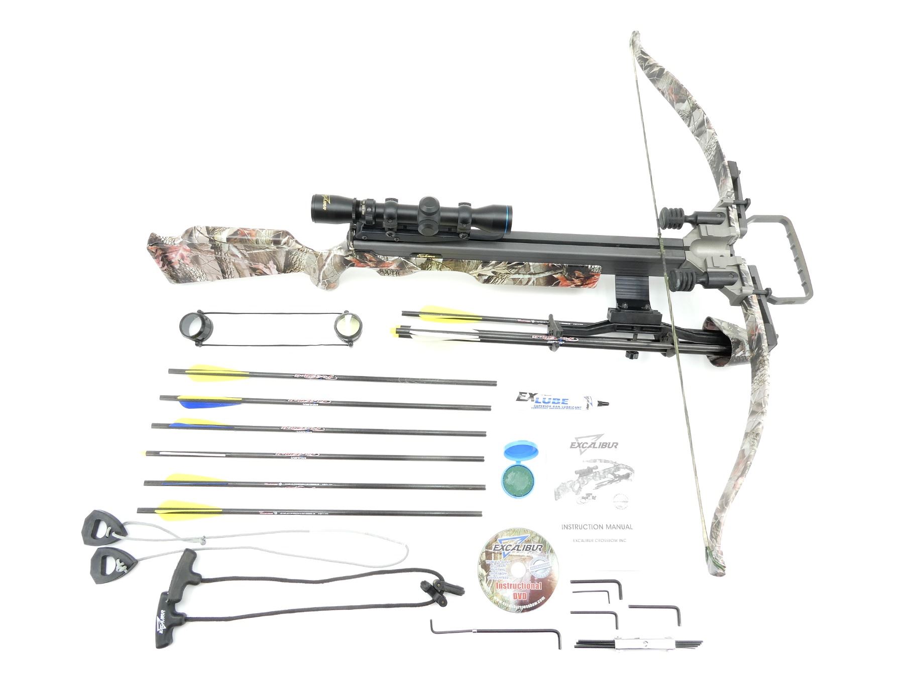 LOT INCLUDES; (1) RECURVE CROSSBOW, APPROX. DRAW WEIGHT 200 LBS, APPROX. SPEED UP TO 320 FPS, STROKE 15.5", ARROW LENGTH 20", (6) EXCALIBUR 20" BOLTS, (1) EXCALIBUR VARI ZONE SCOPE, CLEAR OPTICS, (1) LENS COVERS, (4) BOLT QUIVER, (4) BOLTS, (1) COCKING AID, (1) STRINGING AID, (1) STRING, (1) INSTRUCTIONAL MANUAL, (1) DVD, (1) SERVING WAX, (1) EX RAIL LUBE, ASSORTED ALLEN KEYS, APPROX 6 1/2 LBS, APPROX. OAL 38 1/2", SHOWS WEAR AND TEAR FROM USAGE, SEE PHOTOS.